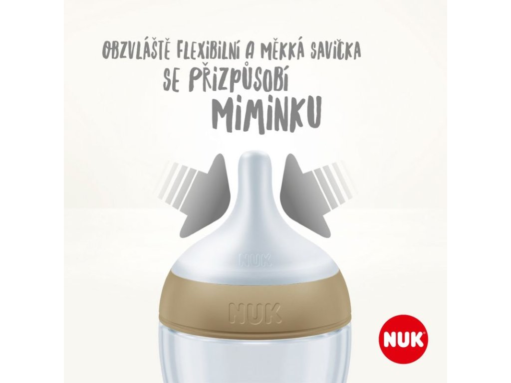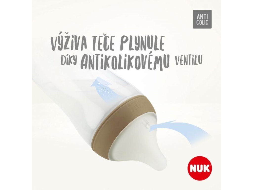Antikolikový ventil NUK a výběr ze tří různých saviček zajišťují plynulý tok tekutiny.