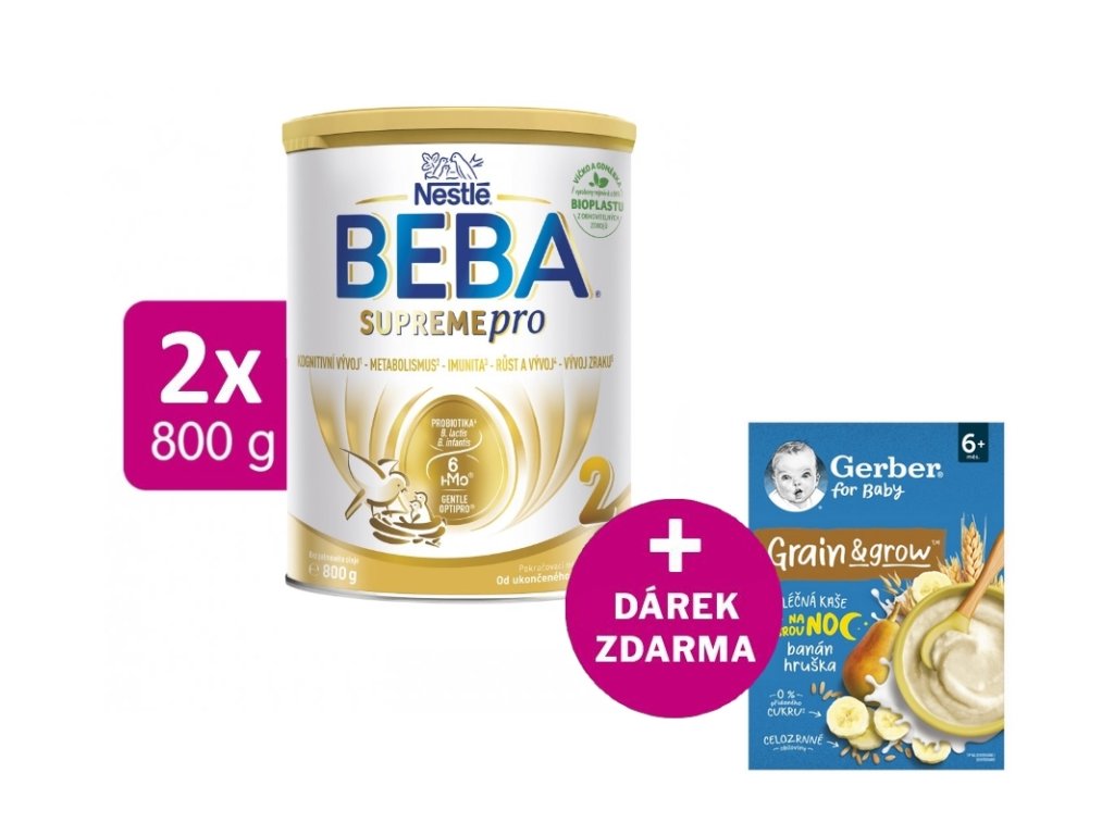 BEBA SUPREMEpro 2, 6 HMO, 2x800g + GERBER Mléčná kaše pšenično-ovesná banán a hruška 200g