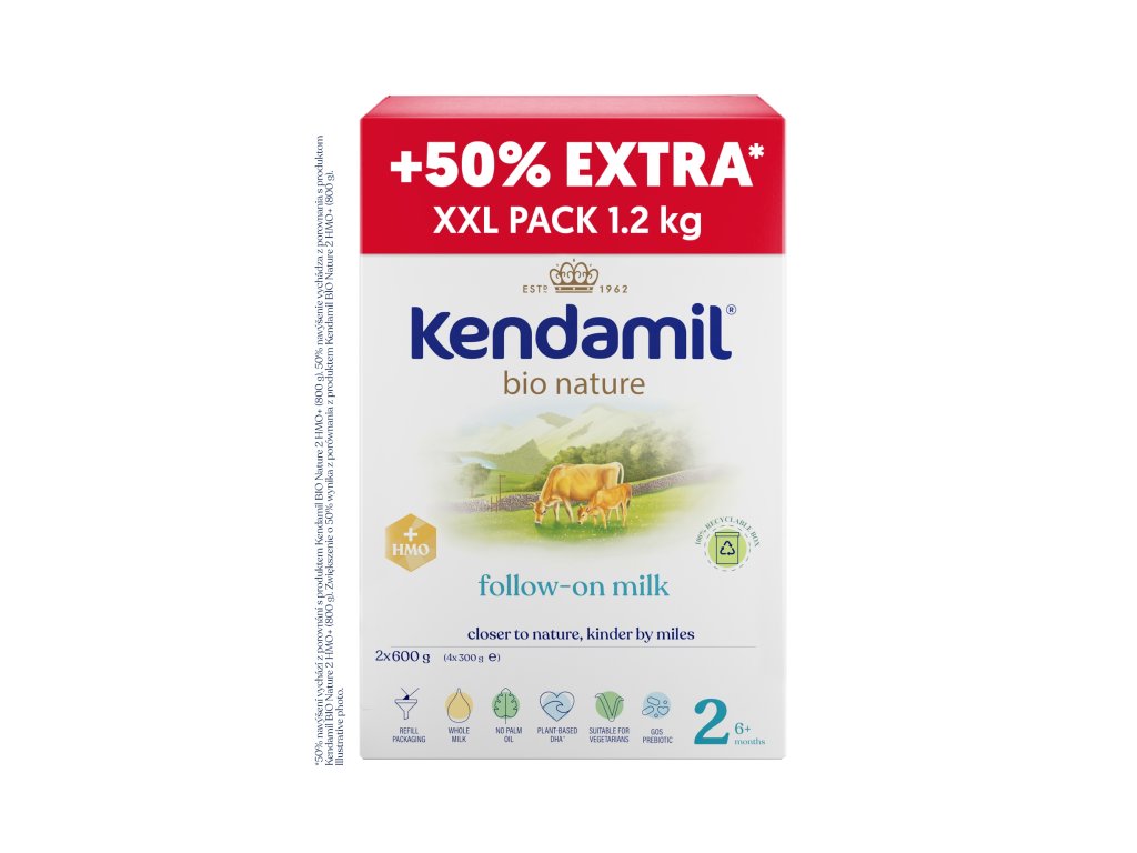 Nová vylepšená receptura s oligosacharidem mateřského mléka HMO (3´GL) a prebiotiky GOS vznikla na základě 60letého výzkumu a vývoje. Kojenecké mléko Kendamil BIO Nature je inspirováno tím nejlepším z čisté přírody. Jeho základ tvoří především plnotučné kravské mléko v BIO kvalitě s přirozeným obsahem mléčného tuku po vzoru mateřského mléka. Určeno pro miminka od ukončeného 6. měsíce do jeho jednoho roku. Obal je plně recyklovatelný.