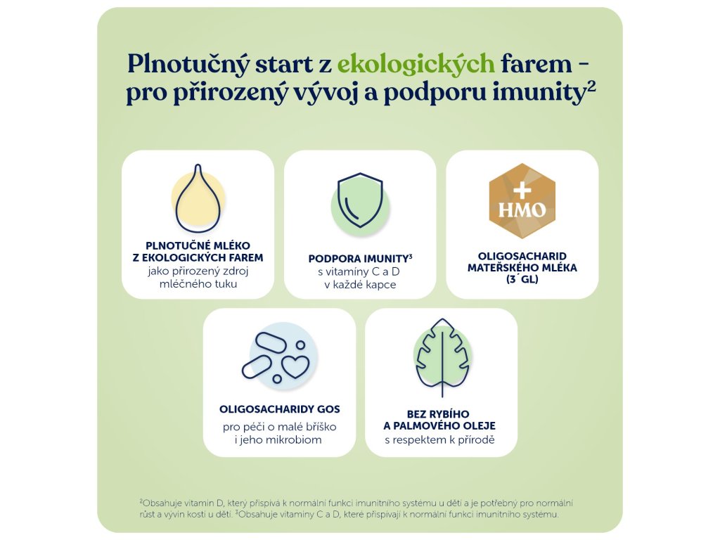 Složení: BIO plnotučné MLÉKO (191,2 g tekutého mléka na 100 g prášku), BIO odstředěné MLÉKO, BIO laktóza (z MLÉKA), BIO rostlinné oleje (slunečnicový, kokosový, řepkový), BIO demineralizovaná bílkovina MLÉČNÉ syrovátky, BIO galaktooligosacharidy (z MLÉKA) 2,1 %, mléčnan vápenatý, fosforečnan vápenatý, hydroxid draselný, vitamín C, citrát vápenatý, olej z mikrořas Schizochytrium sp., chlorid draselný, síran železnatý, vitamín E, síran zinečnatý, niacin, kyselina pantothenová, síran měďnatý, thiamin, riboflavin, vitamín A, vitamín B6, síran manganatý, kyselina listová, seleničitan sodný, jodid draselný, vitamín K, vitamín D3 , biotin, vitamín B12. Alergeny jsou vyznačeny VELKÝMI PÍSMENY. Složeni se vztahuje ke sušenému stavu potraviny.