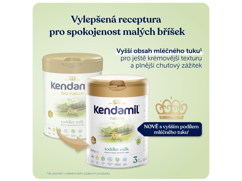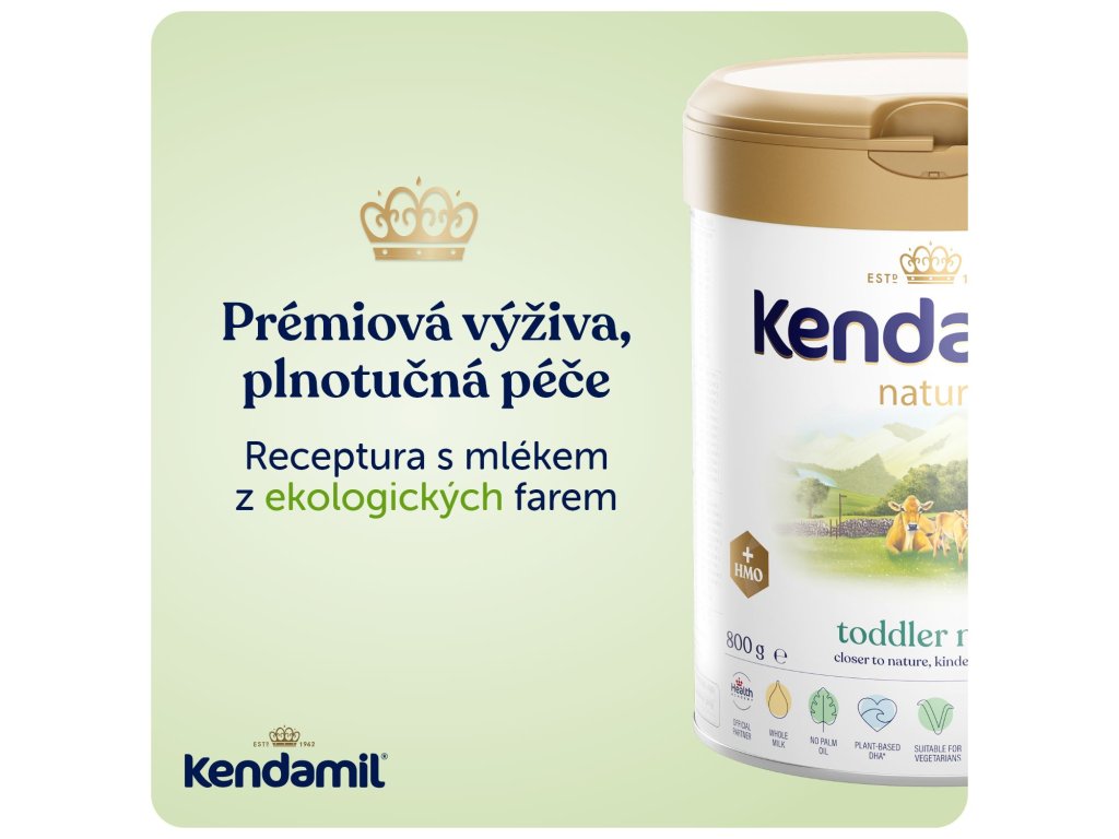 Nová vylepšená receptura s oligosacharidem mateřského mléka HMO (3´GL) a prebiotiky GOS vznikla na základě 60letého výzkumu a vývoje. Kojenecké mléko Kendamil BIO Nature je inspirováno tím nejlepším z čisté přírody. Jeho základ tvoří především plnotučné kravské mléko v BIO kvalitě s přirozeným obsahem mléčného tuku po vzoru mateřského mléka. Určeno pro děti od jednoho roku. Obal je plně recyklovatelný.