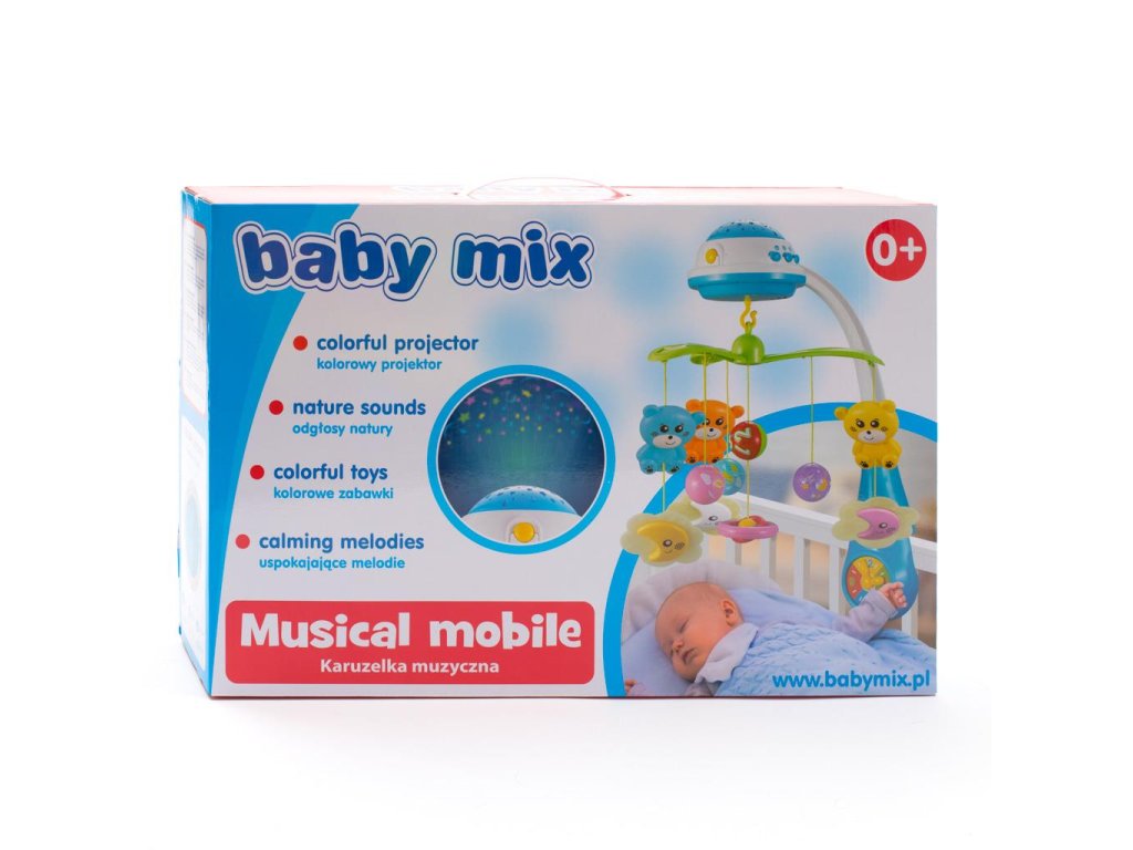 Kolotoč nad postýlku se světelným projektorem Baby Mix. Je určen nejmenším dětem, které se ještě samy nepohybují. Rozvíjí zrakově-pohybovou koordinaci dítěte a uklidňuje ho před usnutím.