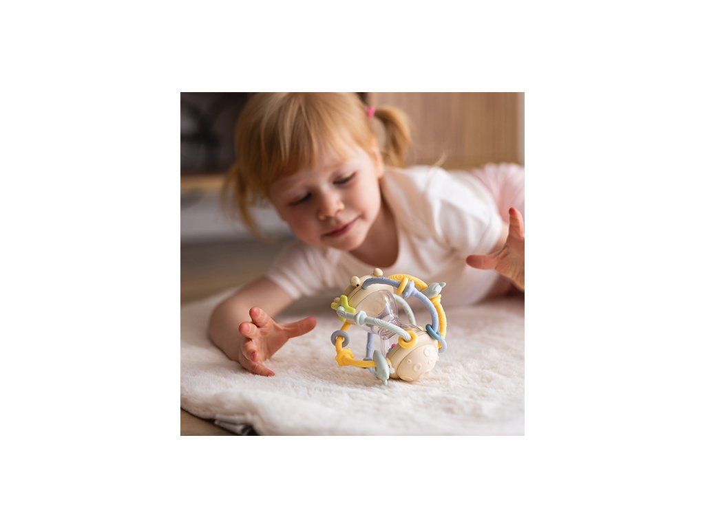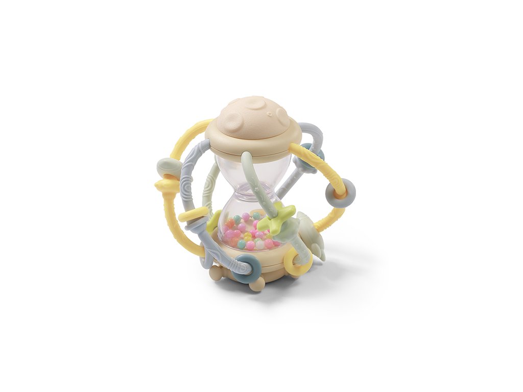 - Přesýpací hodiny - Uvnitř chrastítka s kousátkem se nacházejí přesýpací hodiny s korálky. Barevné korálky, které se posouvají, vytvářejí fascinující dekoraci a přitahují pozornost. Vaše dítě se učí pozorování a vztahům příčiny a následku.