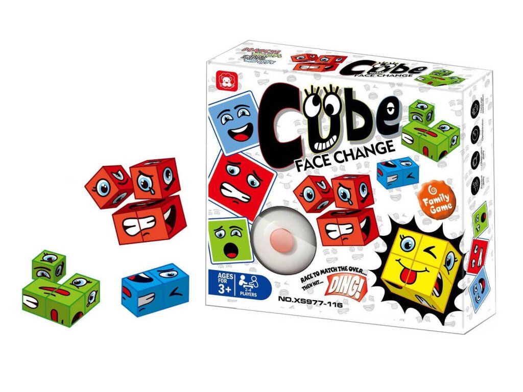 Magické kostky obličeje set. Součástí 4 magické kostky (žlutá, zelená, červená modrá), zvonek, karty s obličeji.