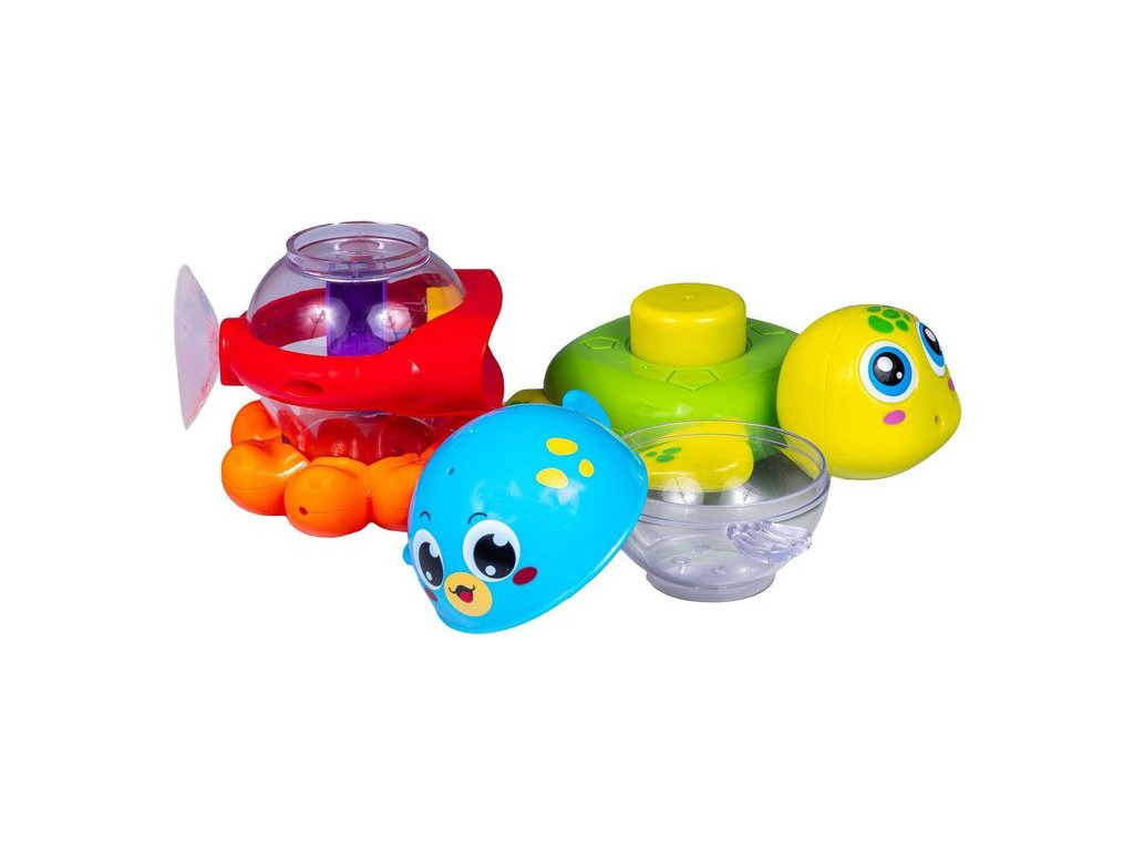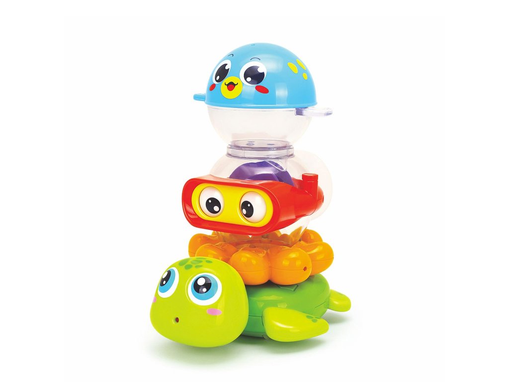 - Zvířátka umístěná jedno na druhém vytvoří pyramidu, kterou batole může nalévat vodou nebo si s jednotlivými zvířátky hrát.