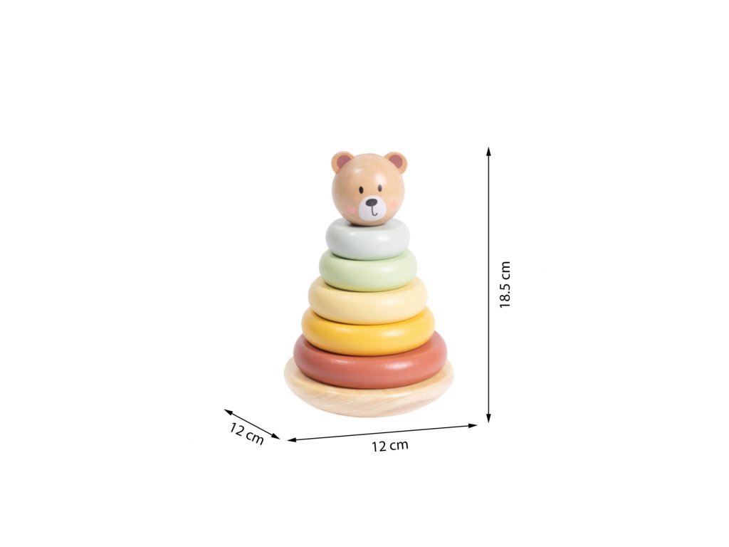 Tato dřevěná věž s disky a roztomilou hlavou medvídka od Tooky Toy kombinuje radost z kreativní hry s podporou rozvoje dítěte. Jasné pastelové barvy, robustní konstrukce a možnost uspořádat dílky různými způsoby z ní dělají nejen klasickou pyramidu, ale také inspiraci pro objevování, experimentování a učení prostřednictvím pohybu a fantazie. Batolata si mohou stavět, ničit a vytvářet vlastní struktury a zároveň si rozvíjet zručnost prstů.