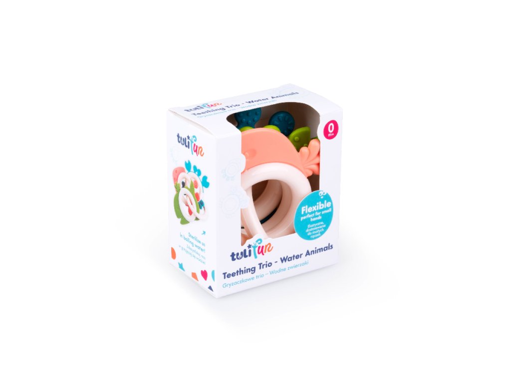 Společníci při prořezávání zoubků v oceánském prostředí! Tři kousátka jsou spojena kroužkem, který slouží také jako praktická rukojeť. Každé z nich má jedinečný tvar a barvu. Kousátka mají výstupky, které jemně masírují bolavé dásně dítěte, kterému se prořezávají zoubky.