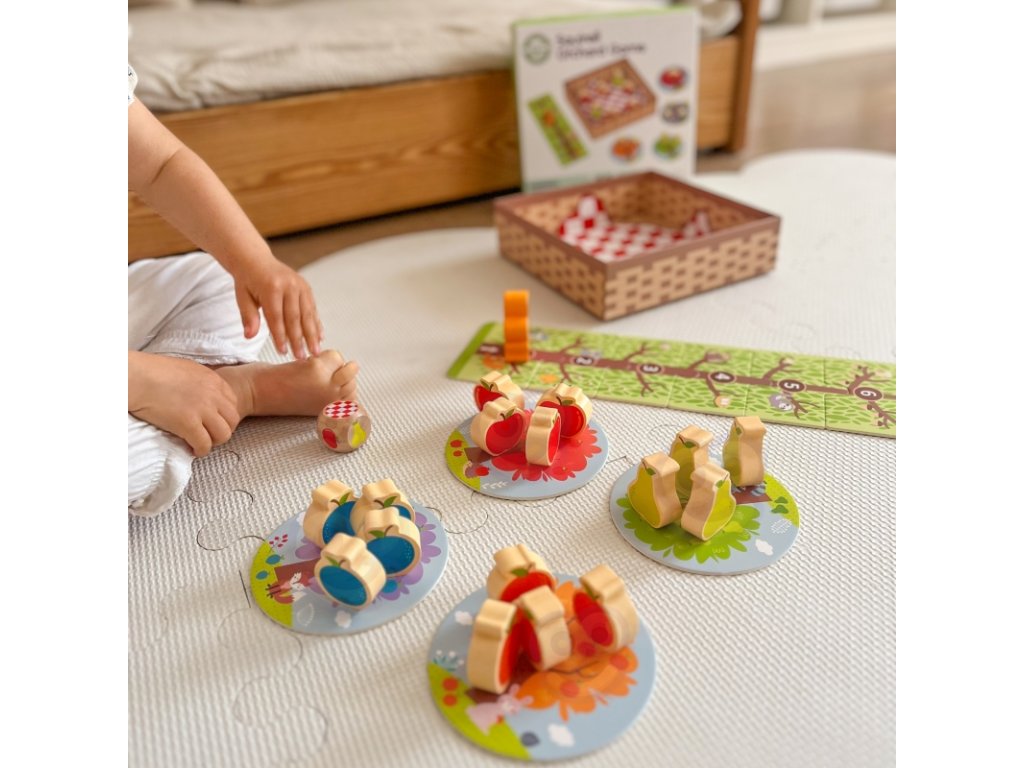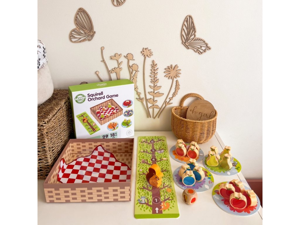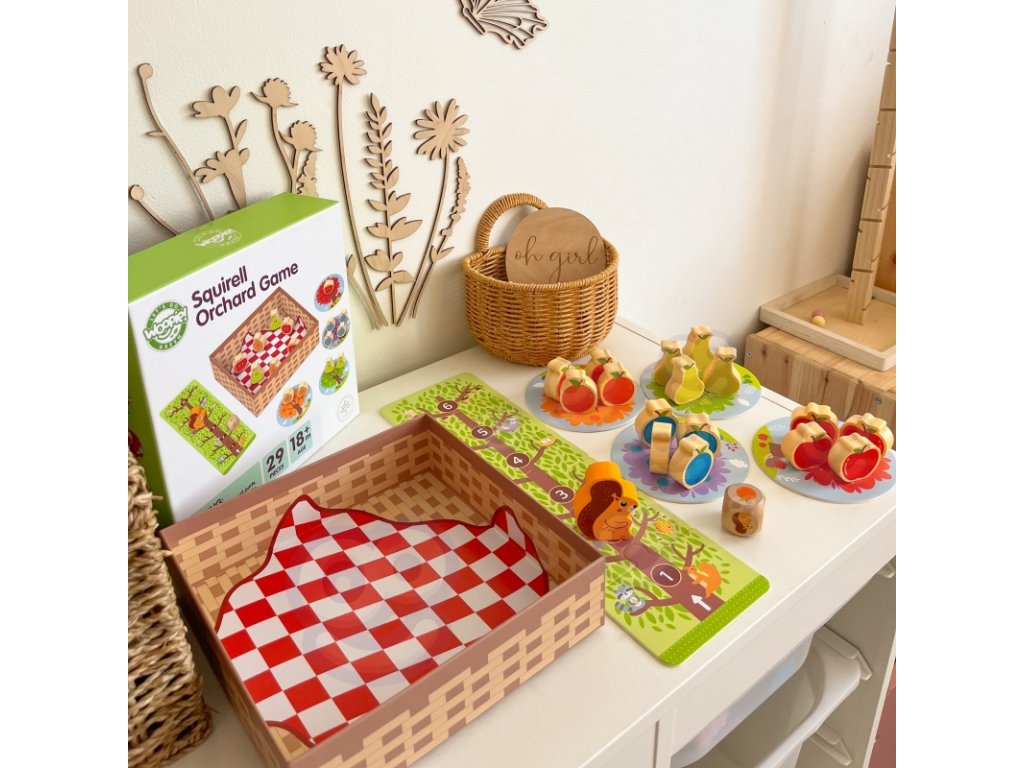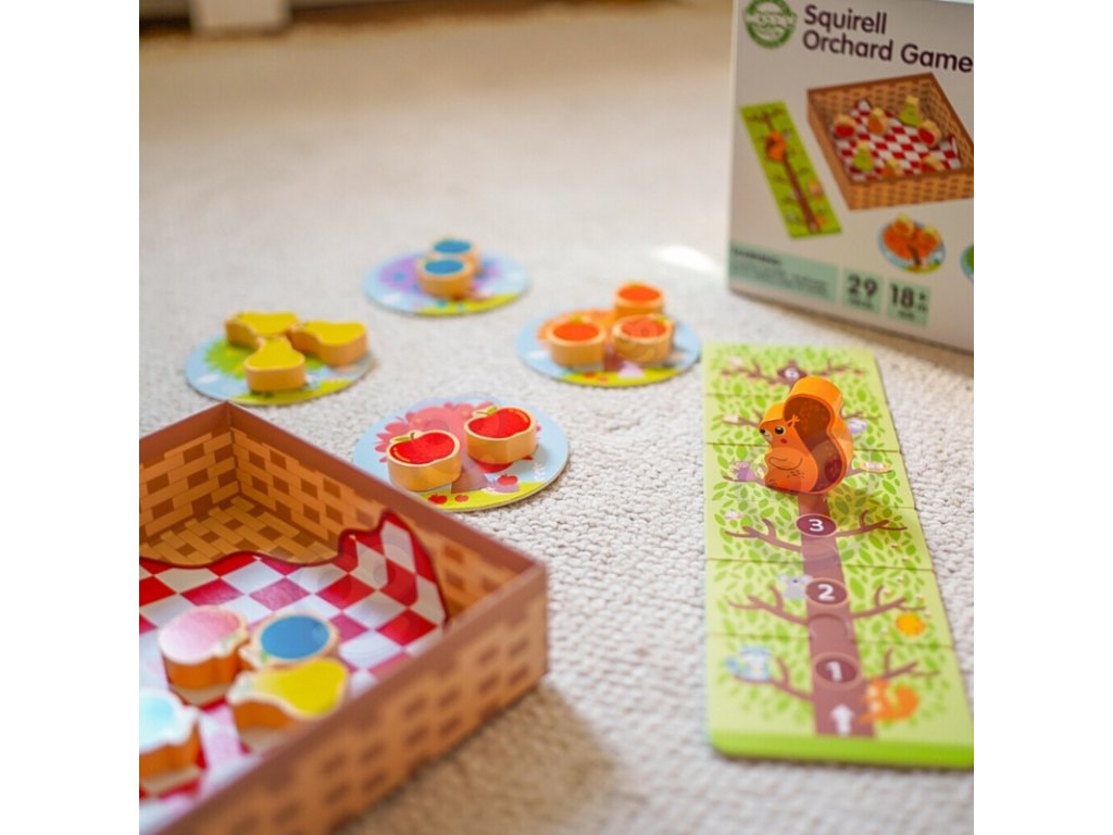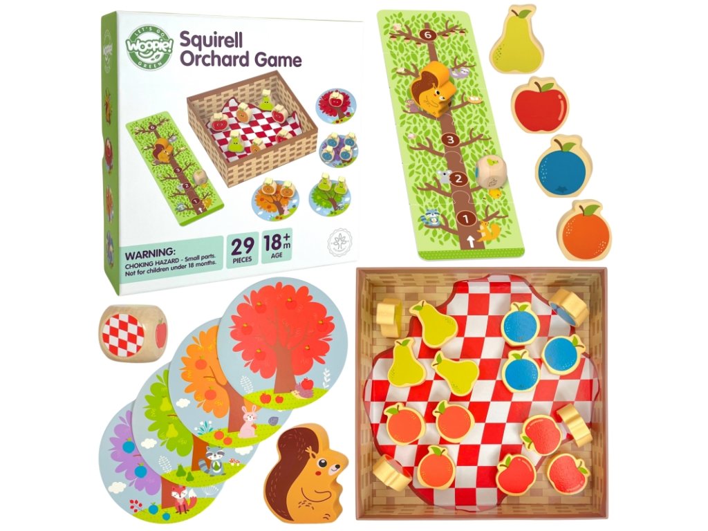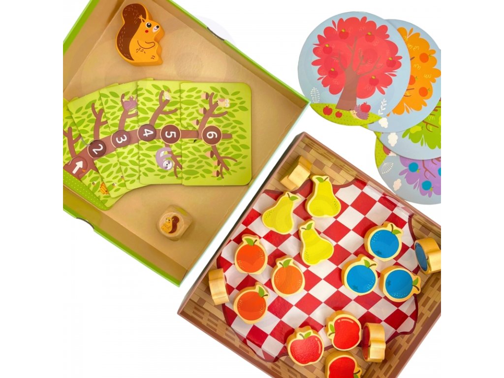 Cíl je jednoduchý – nasbírejte všechno ovoce v košíku dříve, než se veverce podaří je „utrhnout“ ze stromu! Tato okouzlující hra učí spolupráci, plánování a soustředění a zároveň poskytuje spoustu smíchu a vzrušení. Vyrobena z vysoce kvalitního dřeva a krásně ilustrovaná, seznamuje děti se světem deskových her prostřednictvím hry a akce.