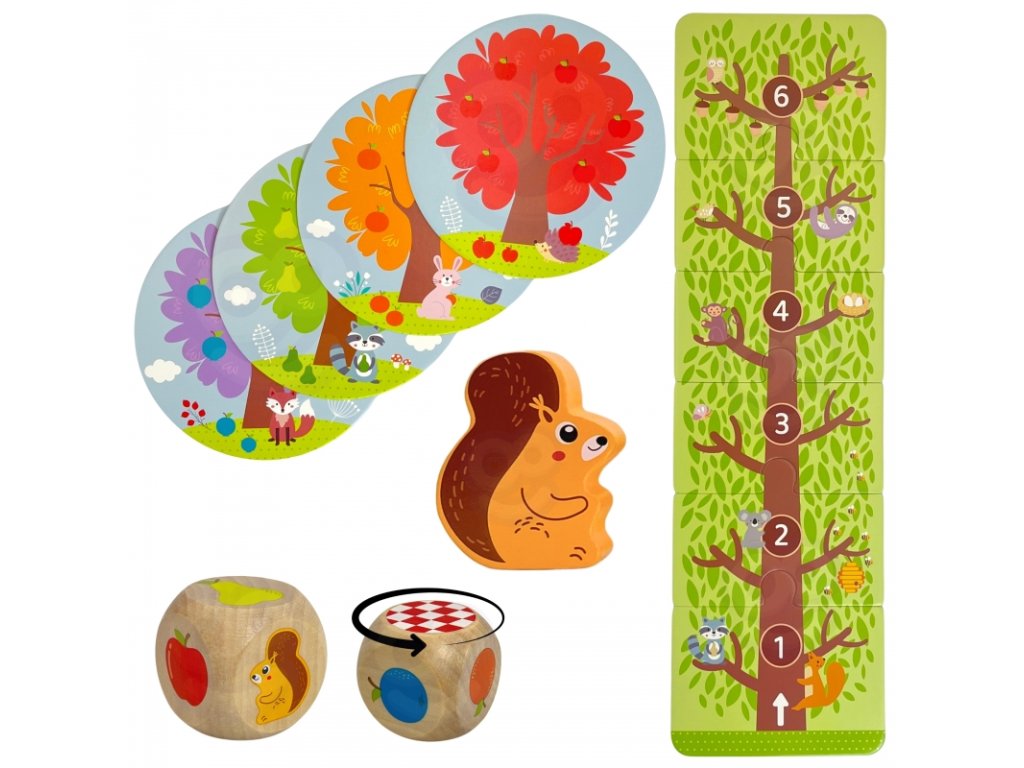 Sada obsahuje: Herní deska ve tvaru stromu, Figurka veverky, 12 barevných druhů ovoce, 4 dřevěné stromy, Sklizňový koš, Kostka s obrázky ovoce a veverky
