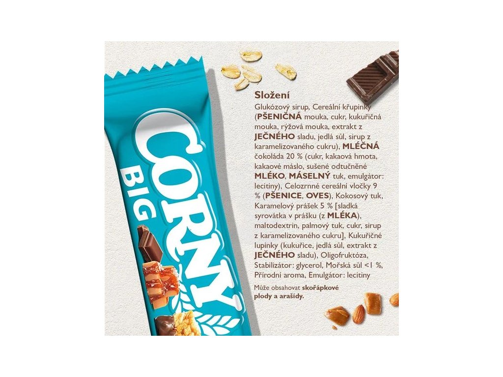 V nové tyčince si vychutnej dokonalou kombinaci slaného karamelu, celozrnných cereálií a křupinek, která je navíc zalitá lahodnou mléčnou čokoládou. Corny BIG Slaný karamel tě zasytí jako rychlá svačinka nebo jednoduše zažene chuť na něco sladkého.