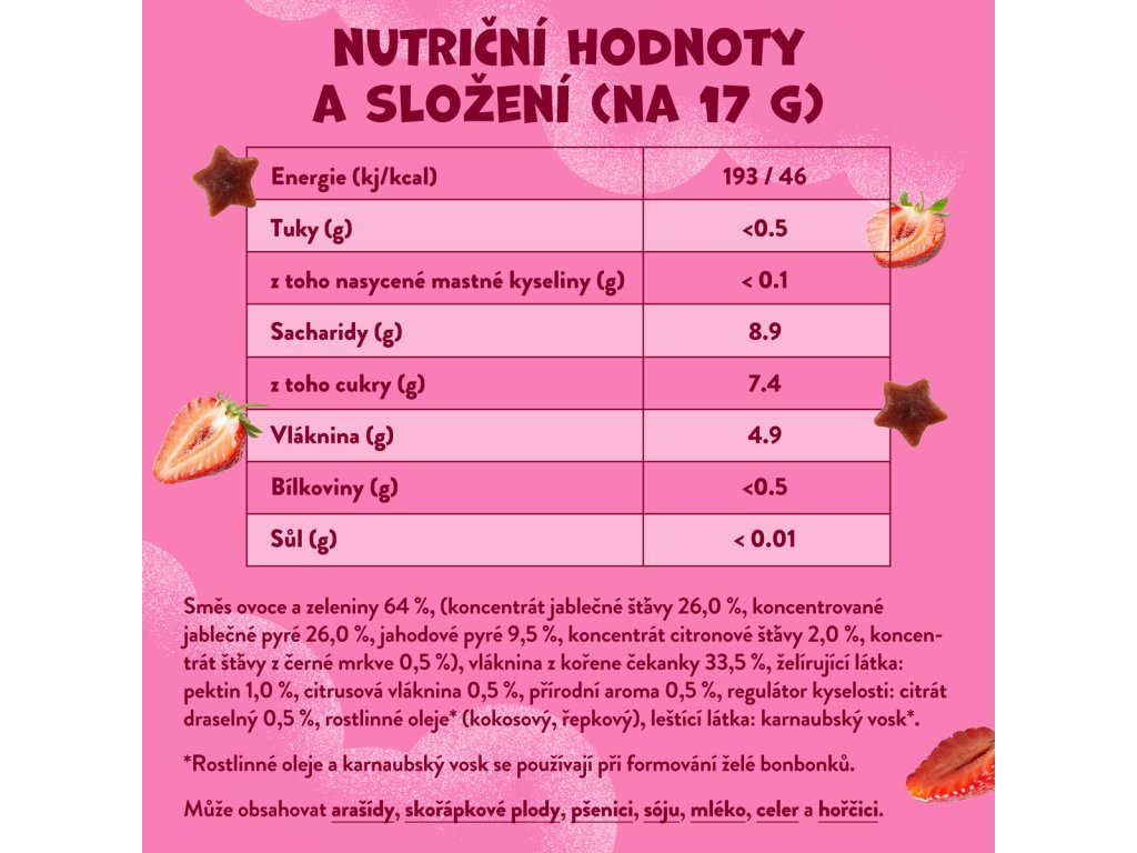 Složení: Směs ovoce a zeleniny 64 %, (koncentrát jablečné šťávy 26,0 %, koncentrované jablečné pyré 26,0 %, jahodové pyré 9,5 %, koncentrát citronové šťávy 2,0 %, koncentrát šťávy z černé mrkve 0,5 %), vláknina z kořene čekanky 33,5 %, želírující látka: pektin 1,0 %, citrusová vláknina 0,5 %, přírodní aroma 0,5 %, regulátor kyselosti: citrát draselný 0,5 %, rostlinné oleje* (kokosový, řepkový), leštící látka: karnaubský vosk*.