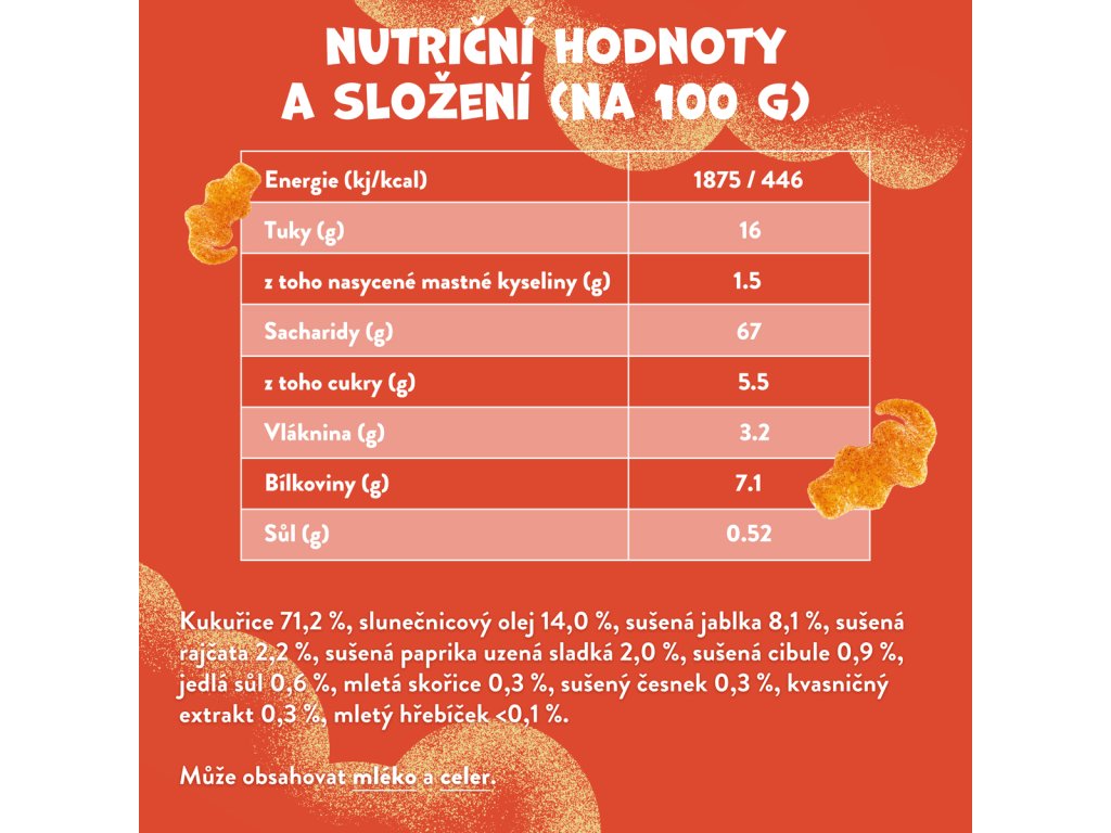 Složení: Kukuřice 71, 2 %, Slunečnicový olej 14, 0 %, Sušená jablka 8, 1 %, Sušená rajčata 2, 2 %, Sušená paprika uzená sladká 2, 0 %, Sušená cibule 0, 9 %, Jedlá sůl 0, 6 %, Mletá skořice 0, 3 %, Sušený česnek 0, 3 %, Kvasničný extrakt 0, 3 %, Mletý hřebíček <0, 1 %