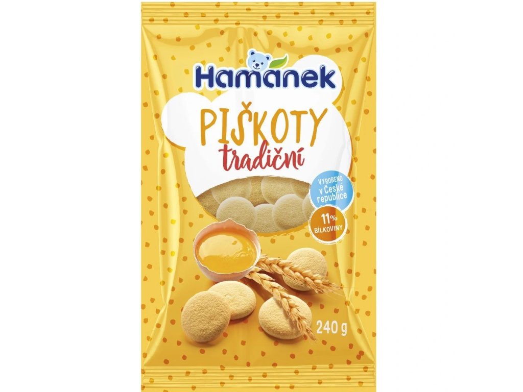 Tradiční piškoty Hamánek jsou upečené podle léty ověřené receptury z těch nejlepších surovin. BENEFITY: 11% bílkovin, vyrobeno v ČR, bez konzervantů a barviv, po generace vyhledávaná pochoutka.