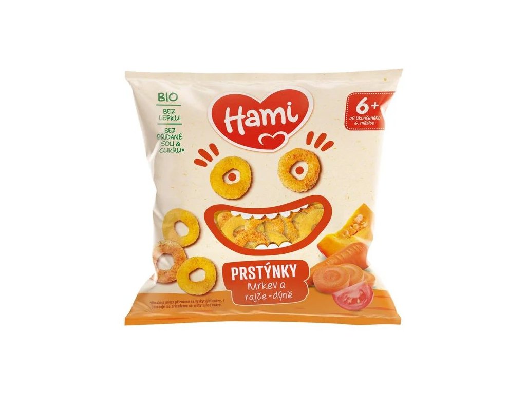 Dopřejte svému děťátku chutnou a čistou svačinku! Hami Prstýnky se dvěma příchutěmi (mrkev a rajče-dýně) jsou hravá BIO svačinka pro děti od ukončeného 6. měsíce, která potěší nejen chutí, ale i tvarem přizpůsobeným malým ručičkám. Křupky se v pusince snadno rozpouštějí, a proto jsou ideální pro první zoubky. Díky dvěma přirozeně sladkým zeleninovým variantám bez přidané soli a cukru** si děti mohou bezpečně osvojovat nové chutě i dovednosti. Produkt neobsahuje lepek, není smažený a je vyroben z kvalitních BIO surovin, což z něj dělá praktickou a výživově šetrnou volbu na svačinku doma i na cestách.