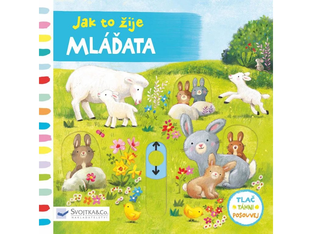 Prohlížej si stránky, pohybuj obrázky a uvidíš, jak to žije mezi mláďaty. Toto veršované leporelo je určeno dětem od jednoho roku.
