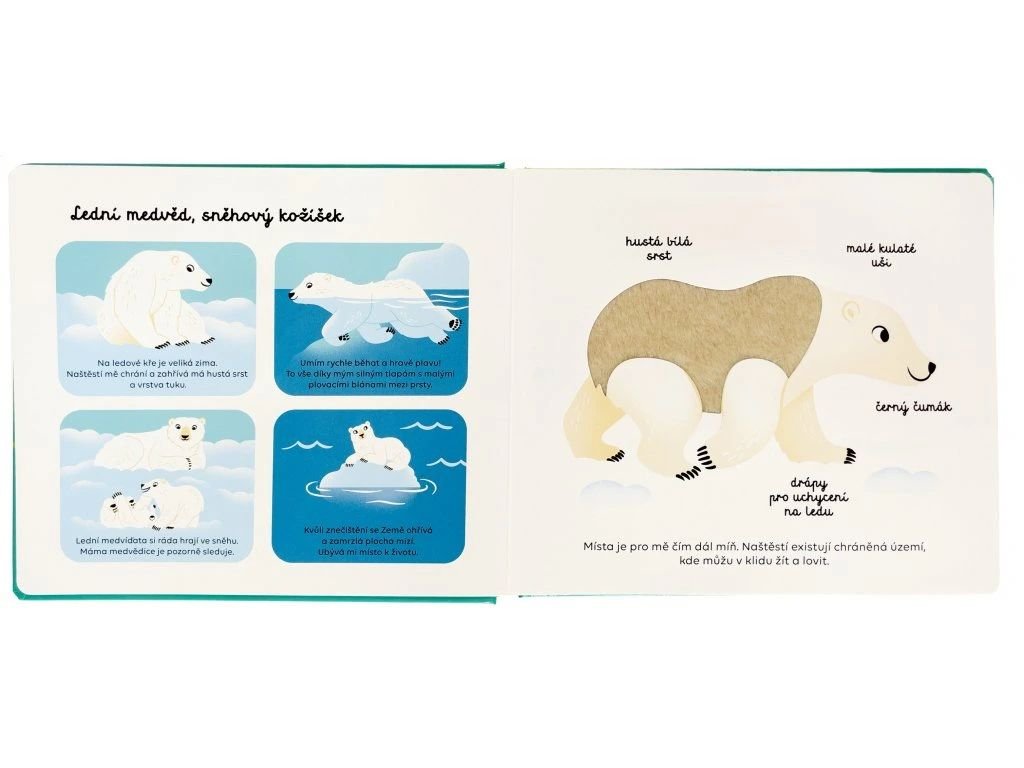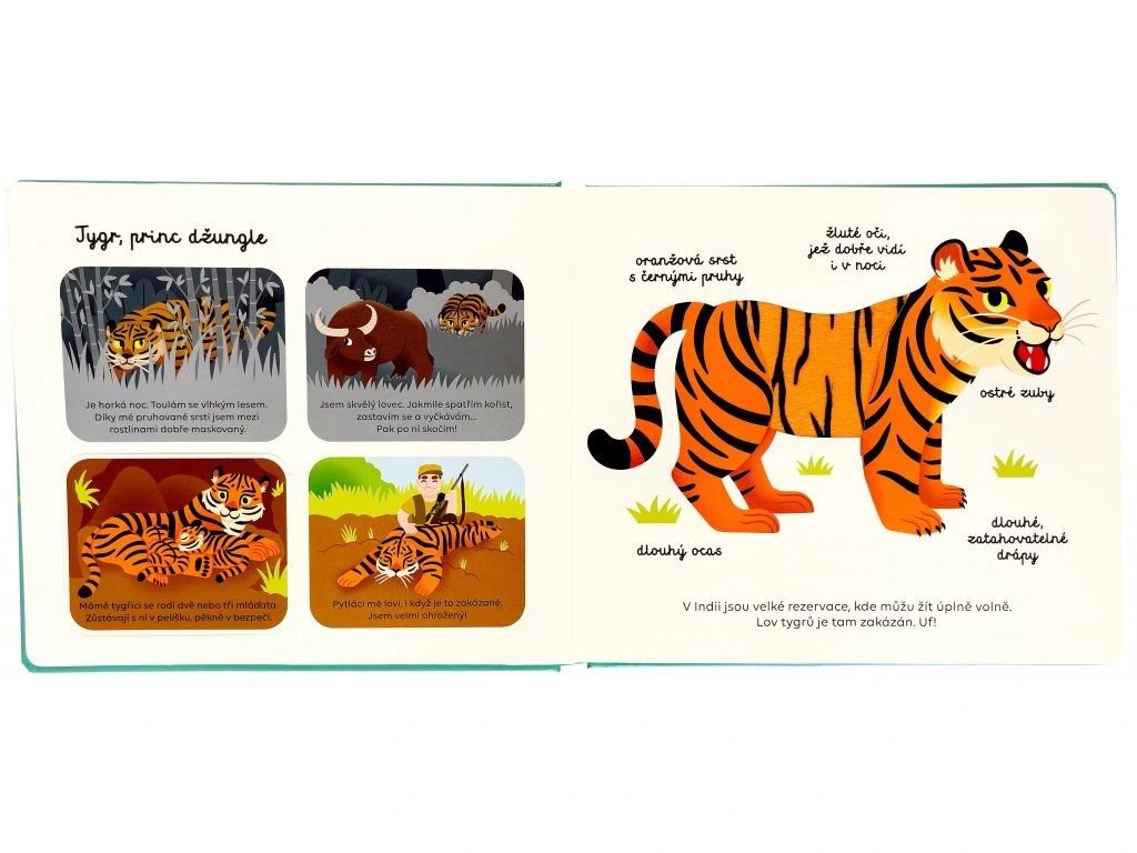Kondorovo peří, tygří srst, velrybí kůže. Zvířata, která je třeba chránit, poznají děti pomocí této knížky s hmatovými prvky a různými materiály k osahání.