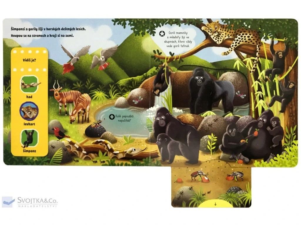 Prozkoumej divoká zvířata žijící na savanách! Najdeš tu vysoké žirafy okusující koruny stromů, gorilí rodinku i hrochy, kteří se ze všeho nejraději povalují ve vodě. Prohlédni si tuto knížku a seznam se s nimi! Na koho asi číhá lev a kam míří sloní rodina? Kniha z řady První objevy s obrázky má v každé scéně pohyblivé prvky, díky nimž se děti seznámí s úžasným světem přírody a zároveň si procvičí jemnou motoriku.