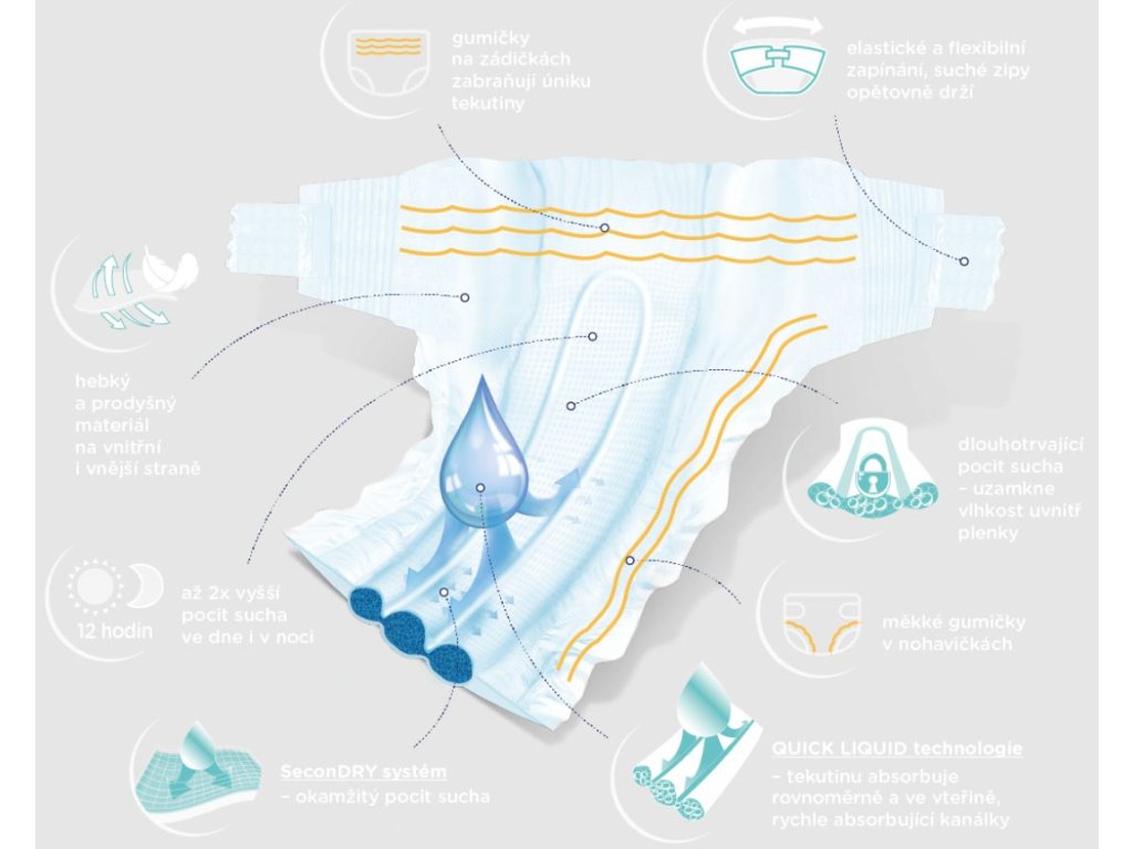 - Systém SeconDry – tato technologie se speciální absorpční vrstvou a kanálky uvnitř jádra zajistí optimální ochranu a pohodlí pokožky miminka.