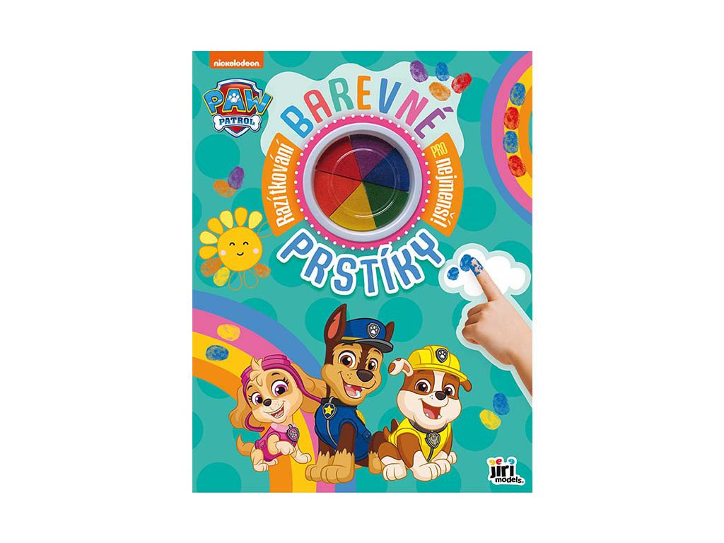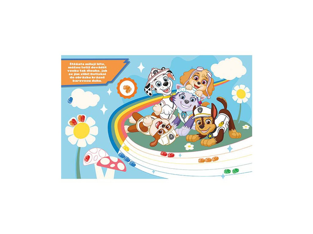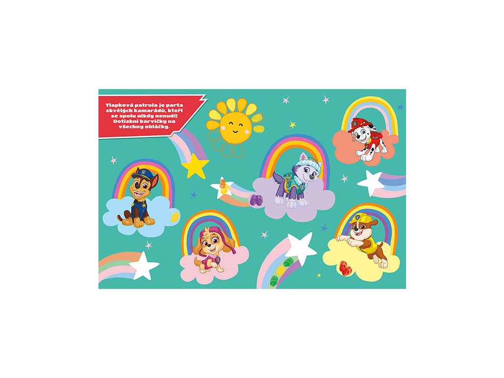 Obsahuje 24 stran plných barevných obrázků s oblíbenými postavičkami z Paw Patrol / Tlapkové Patroly k dorazítkování prstíky a 6 prstových barev.