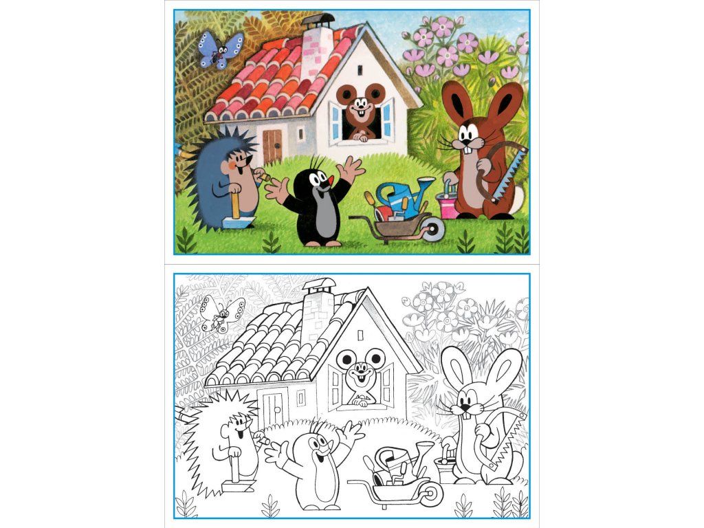 Na 16 stranách klasických omalovánek je jeden obrázek již vybarvený a druhý k vybarvení si mohou děti vymalovat s obrázky Krtečka.