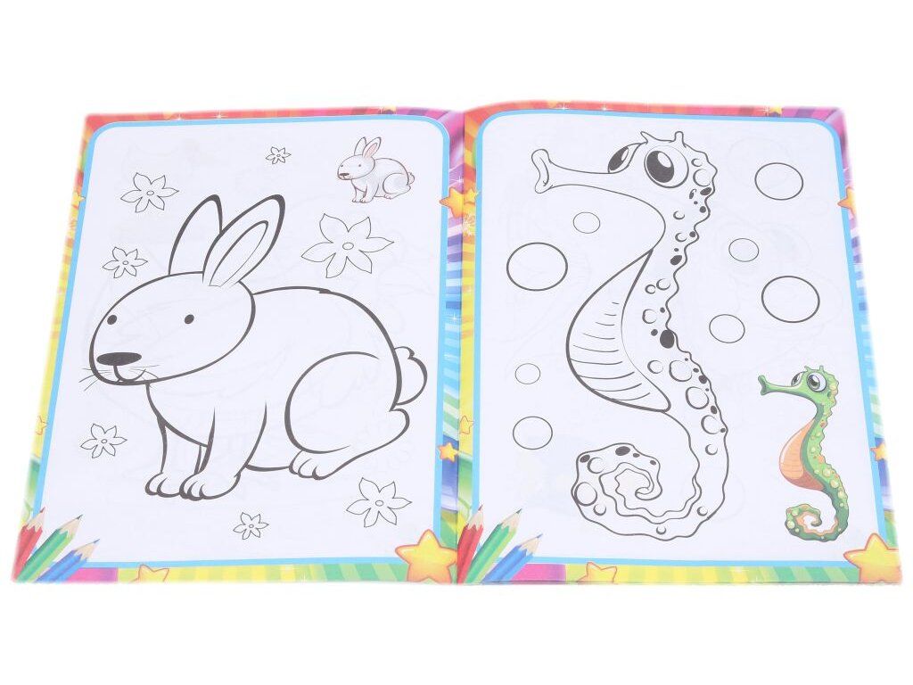 Omalovánky s obrázky různých zvířátek.