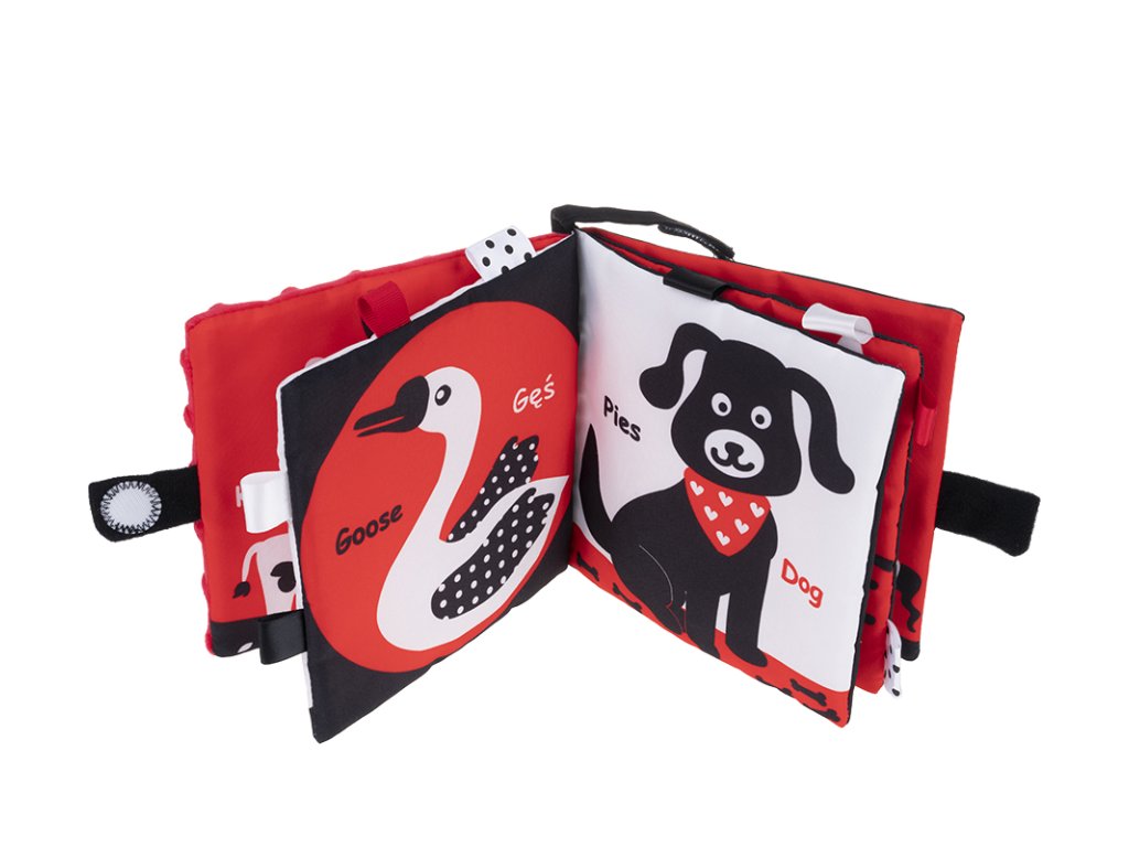 - Obal knížky šuští, což zatraktivňuje hru a stimuluje smysly batolete a bezpečné zrcátko, kterým je vybavena, poslouží k sebepoznání dítěte.