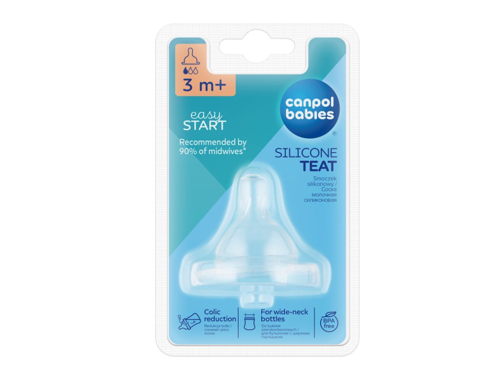 Protikolikový, silikonový dudlík na láhve se širokým hrdlem se velmi dobře odvzdušňuje a tím minimalizuje vznik dětské koliky. Podporuje správný vývoj skusu, řeči a dásní dítěte. Svým tvarem připomíná matčinu bradavku, umožňuje kombinovat krmení z láhve s kojením. Je vyroben z kvalitního silikonu, který se zcela bez chuti a bez zápachu a nemění chuť podávaného pokrmu. Dodává se v šesti velikostech průtoku. Při výběru velikosti dudlíku berte v úvahu také věk dítěte, jeho chuť k jídlu a druh podávaného pokrmu. V balení 1 kus.