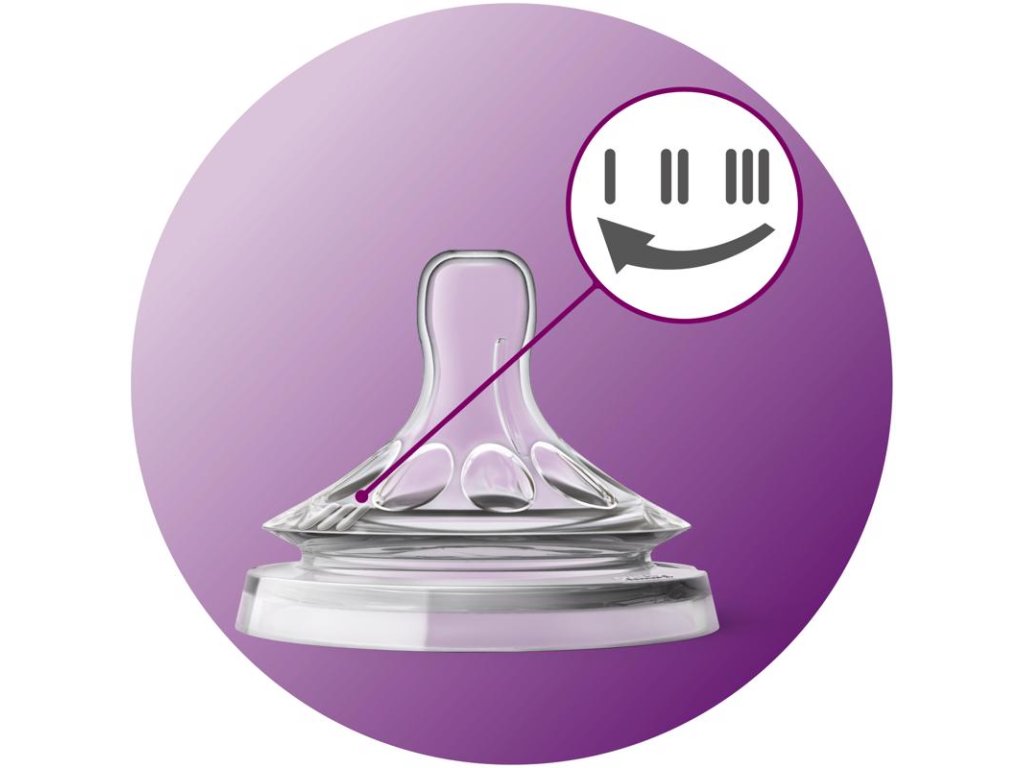 Průtok dudlíku se reguluje natočením láhve v ústech dítěte - pootočením značky I, II, III do polohy oproti nosu miminka ukazuje jaký průtok jste zvolili: