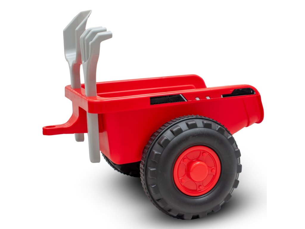 Traktůrek má rozměry 89 × 32 × 35,5 cm, je lehký, ale zároveň stabilní a zvládne zátěž až 25 kg. Protiskluzová kola se postarají o bezpečnou jízdu, a když se malý řidič rozjede, může navíc zatroubit houkačkou. Do přívěsu se vejde vše potřebné – od hraček až po písek – a díky přiložené lopatce a hrábím může začít hned pořádná práce na „poli“.