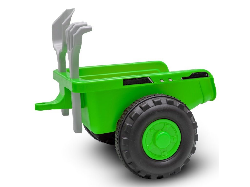 Traktůrek má rozměry 89 × 32 × 35,5 cm, je lehký, ale zároveň stabilní a zvládne zátěž až 25 kg. Protiskluzová kola se postarají o bezpečnou jízdu, a když se malý řidič rozjede, může navíc zatroubit houkačkou. Do přívěsu se vejde vše potřebné – od hraček až po písek – a díky přiložené lopatce a hrábím může začít hned pořádná práce na „poli“.