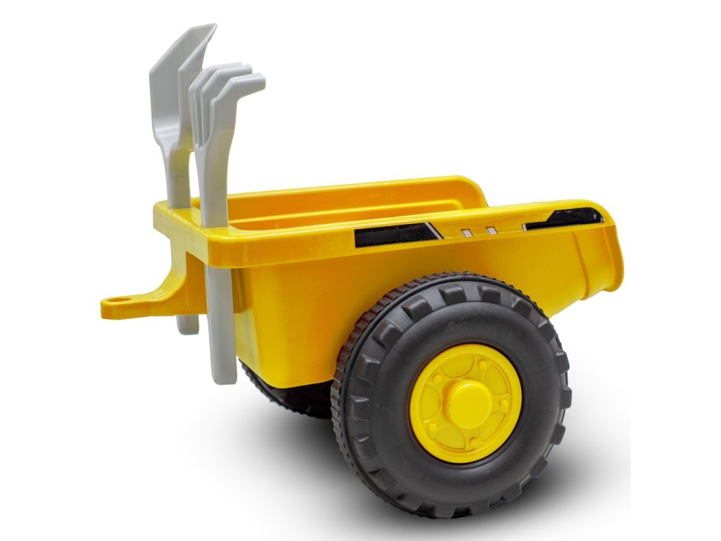 Traktůrek má rozměry 89 × 32 × 35,5 cm, je lehký, ale zároveň stabilní a zvládne zátěž až 25 kg. Protiskluzová kola se postarají o bezpečnou jízdu, a když se malý řidič rozjede, může navíc zatroubit houkačkou. Do přívěsu se vejde vše potřebné – od hraček až po písek – a díky přiložené lopatce a hrábím může začít hned pořádná práce na „poli“.