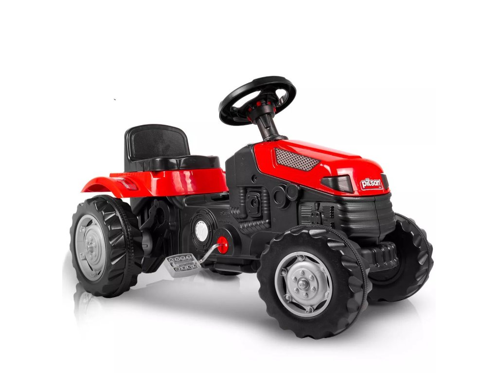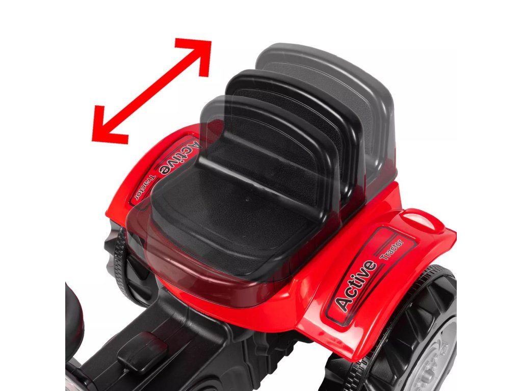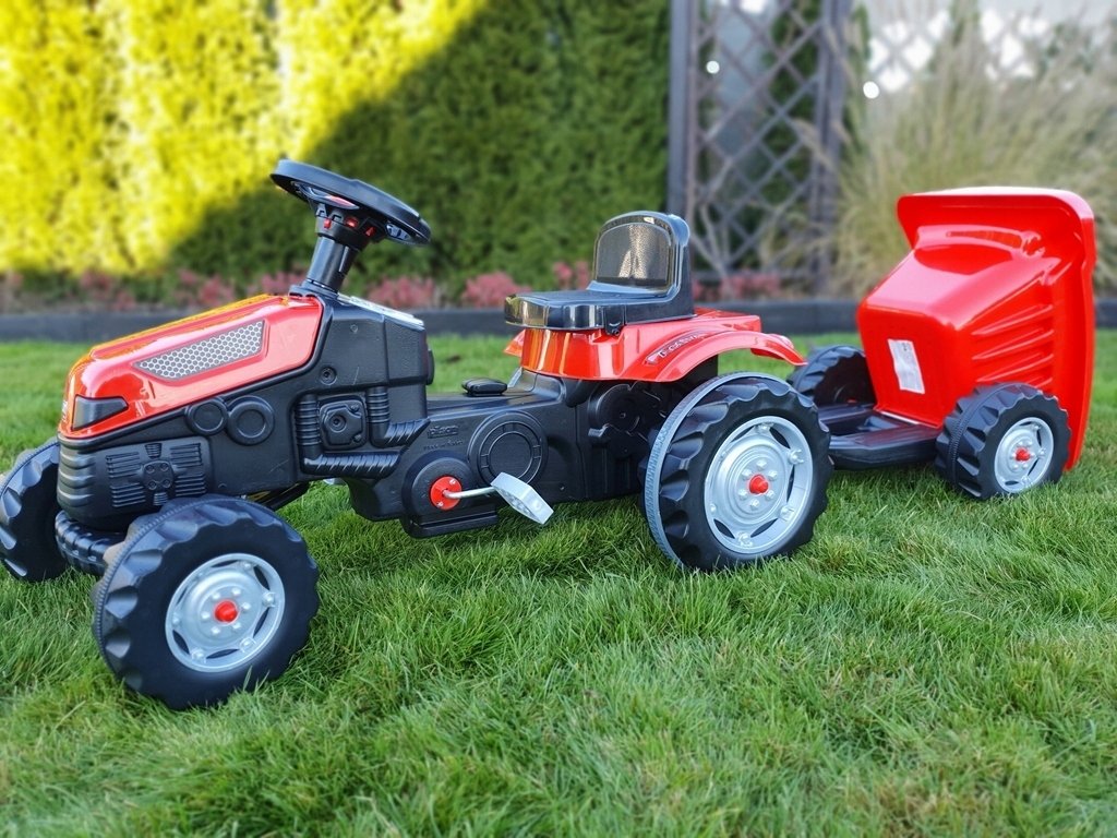 Traktor je poháněn pomocí pedálů, které jsou stabilně upevněny v nosné konstrukci hračky. Velmi zajímavou funkcí je možnost nastavení sedadla v rozsahu dopředu – dozadu, což umožňuje správné připravení vozidla na výšku dítěte. Navíc je součástí vybavení velký přívěs, ve kterém lze přepravovat hračky, kbelíky, lopatky nebo také písek a kameny.
