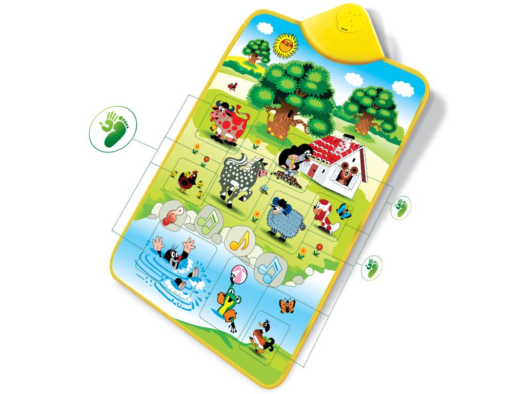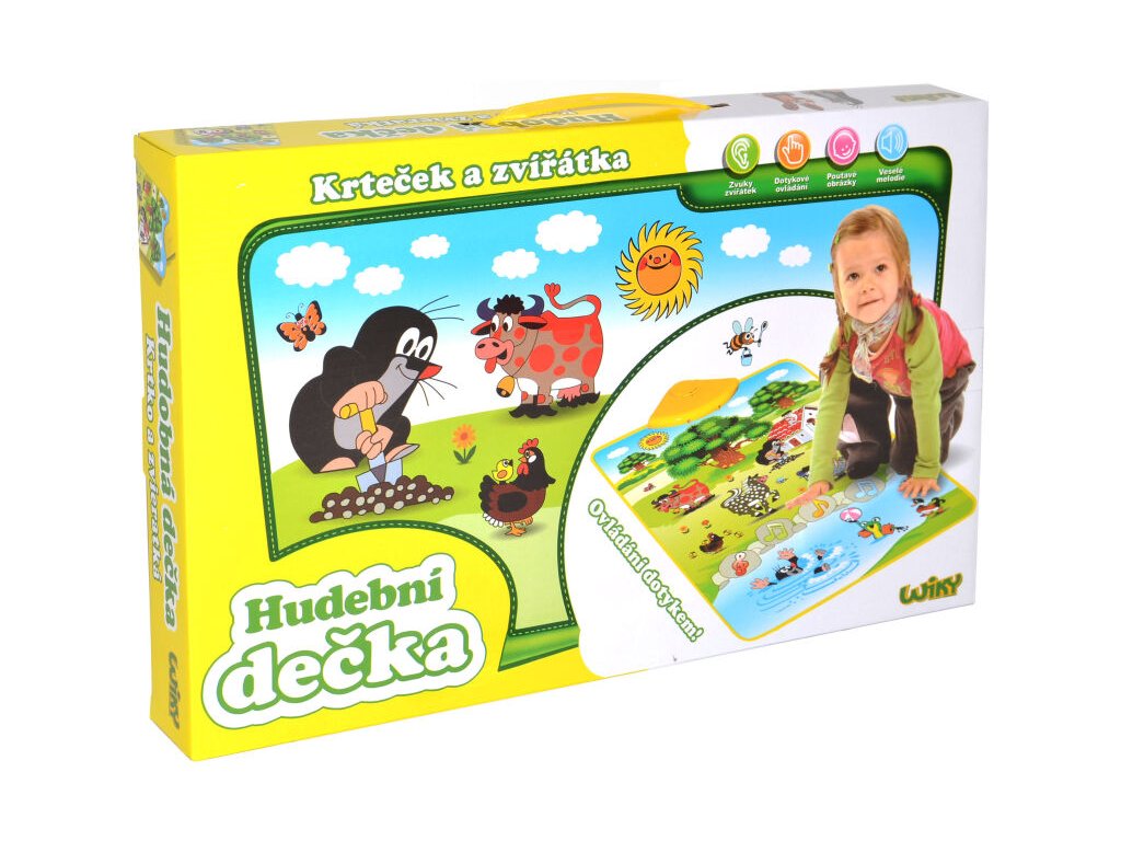 Krtek se vydal pracovat na zahradu. Poznávej s ním zvuky zvířátek na praktické měkké dečce. Rozeznej kravičku, koníka, žabičku a další zvířátka nebo rozehrej písničku. To vše pouhým stiskem ruky!