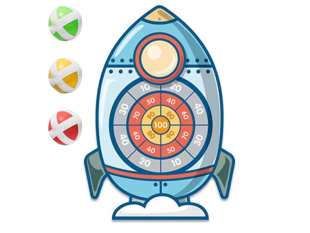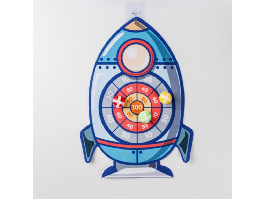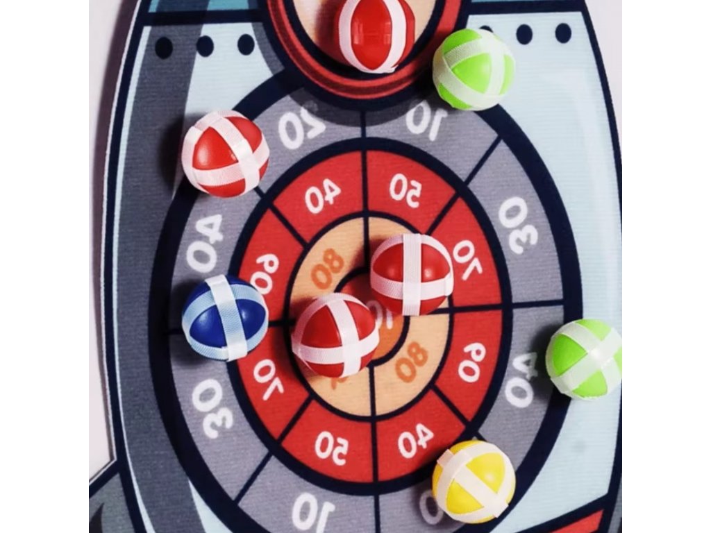 Sada obsahuje: Terč ve tvaru rakety, Kuličky na suchý zip (3 kusy), Háček pro zavěšení štítu