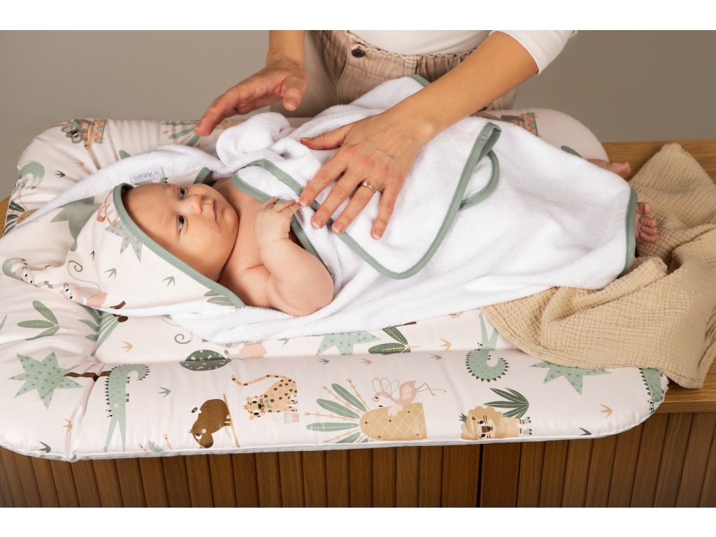 Bambusová osuška s kapucí je nenahraditelná již od prvního koupání. Osuška je vyrobena z vysoce kvalitního bambusu s přídavkem bavlny. Materiál dokonale absorbuje vlhkost a poskytuje účinnou ochranu proti vnější teplotě pro jemnou pokožku vašeho dítěte. Bambusová vlákna vytvářejí extrémně měkký a jemný povlak, který je srovnatelný s nádechem hedvábí. Bambus má antibakteriální vlastnosti, takže je odolný proti pachu. Vzhledem k jemnosti bambusových vláken je třeba udržovat vhodnou teplotu praní, která určuje nedotknutelnost měkké struktury. Osuška je vhodná pro děti s problematickou pokožkou, protože bambusová netkaná textilie má hypoalergenní vlastnosti.
