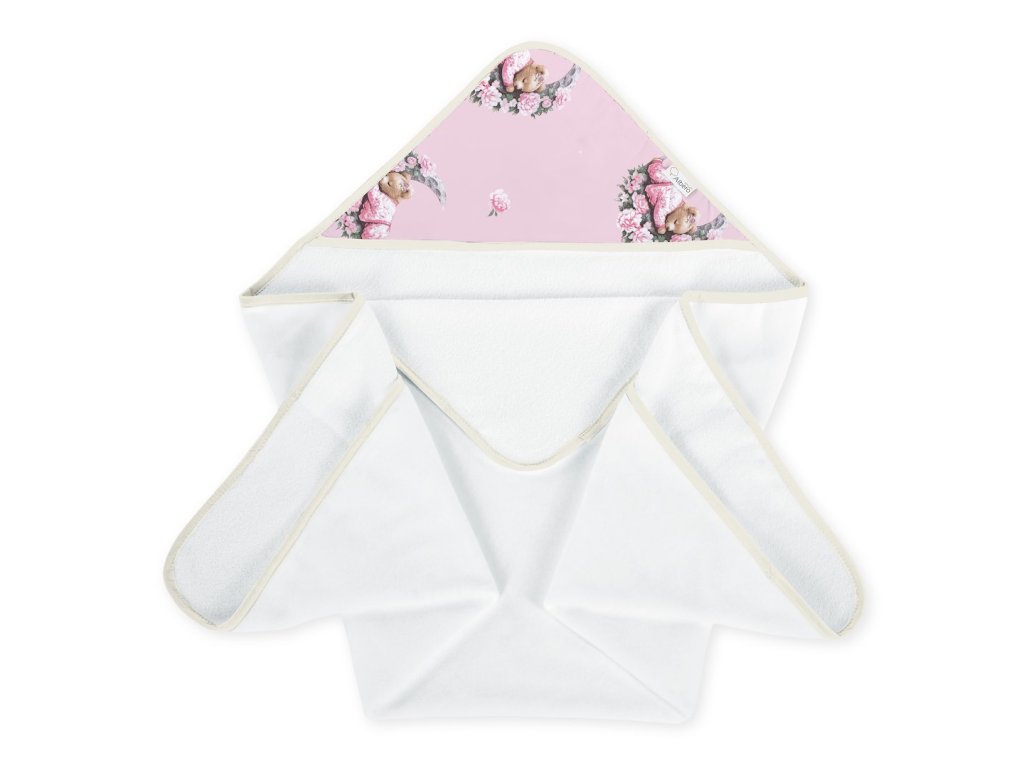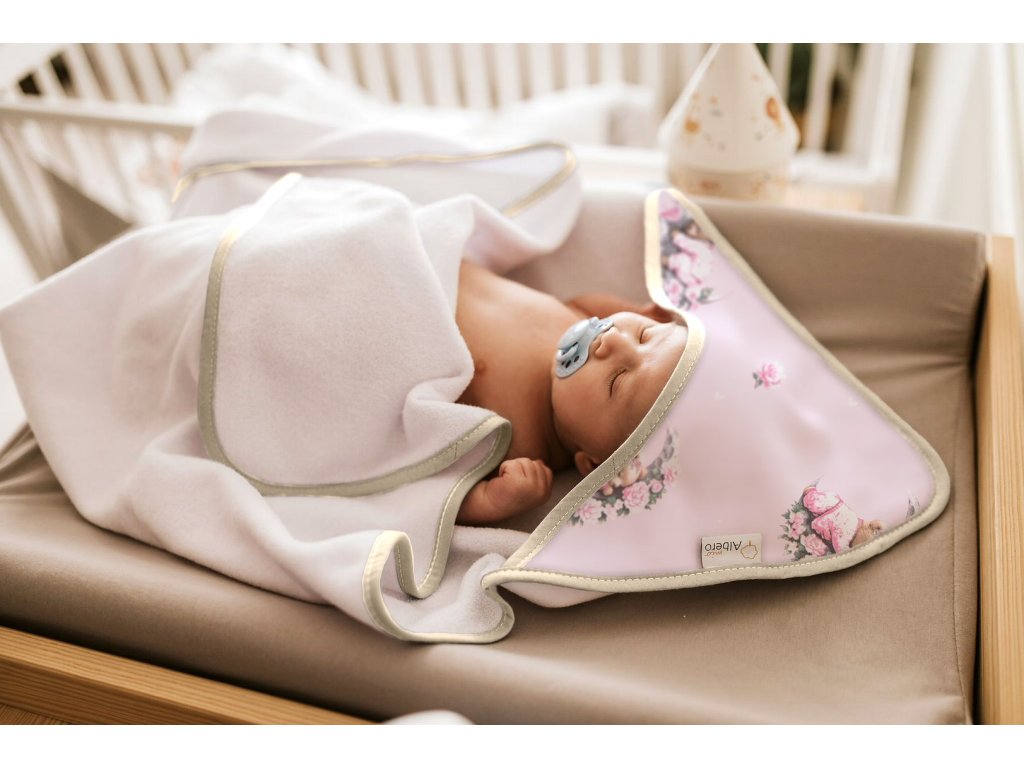 - Volný střih neomezuje a neomezuje pohyby vykoupaného miminka a všitá kapuce chrání mokrou hlavičku miminka před prochladnutím.