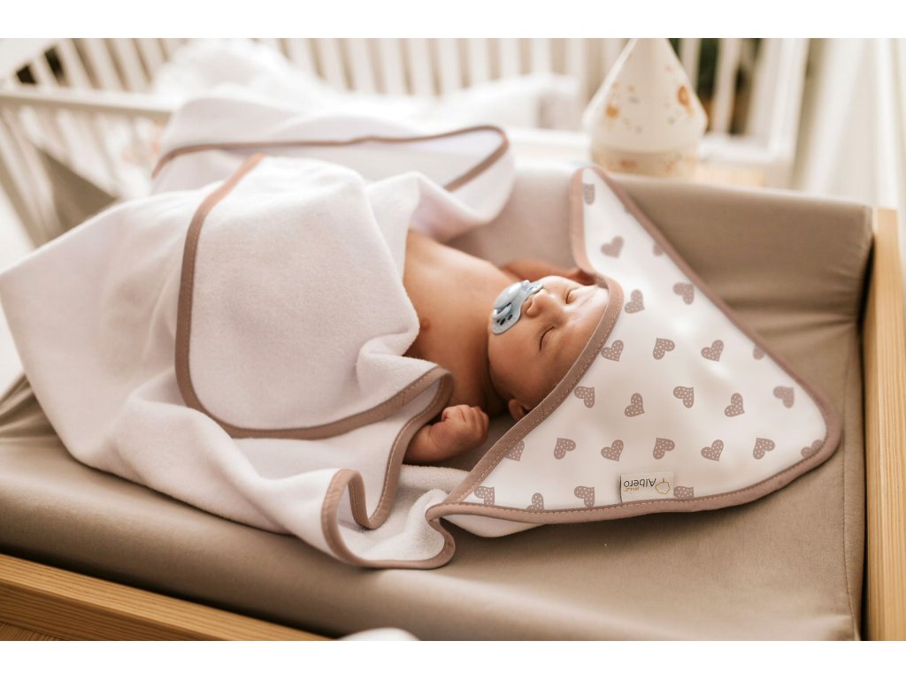 - Volný střih neomezuje a neomezuje pohyby vykoupaného miminka a všitá kapuce chrání mokrou hlavičku miminka před prochladnutím.