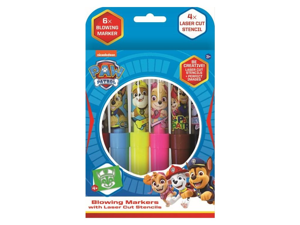 Balení obsahuje 6 barevných foukacích fixů a 4 barevné papírové šablonky v oblíbených pohádkových motivech s Paw Patrol / Tlapkovou patrolou.