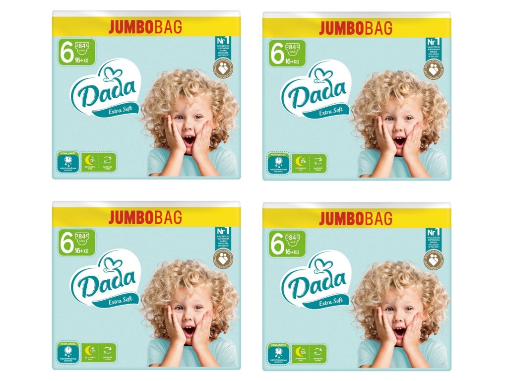 Jednorázové plenky 4x Dada JUMBOBAG Extra Soft 6 EXTRA LARGE, 16+kg, 84ks