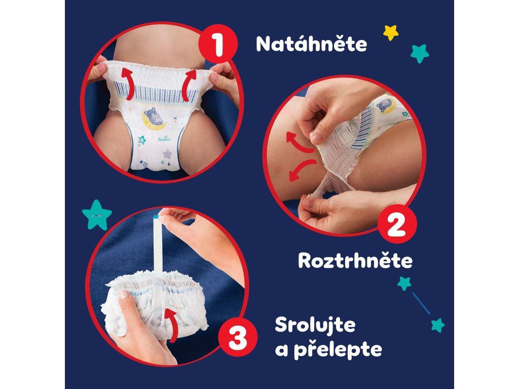 Plenkové kalhotky Pampers Night Pants jsou hebké a pružné, takže se vždy přizpůsobí vašemu dítěti. Pohodlně se navlékají a při přebalování se na stranách dají roztrhnout, což zaručí snadnou výměnu.