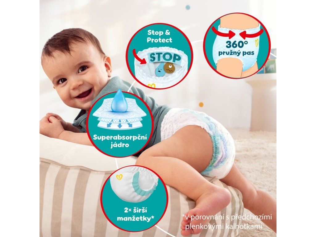 Plenkové kalhotky Pampers Pants jsou hebké a pružné, takže se vždy přizpůsobí vašemu dítěti. Pohodlně se navlékají a při přebalování se na stranách dají roztrhnout, což zaručí snadnou výměnu.