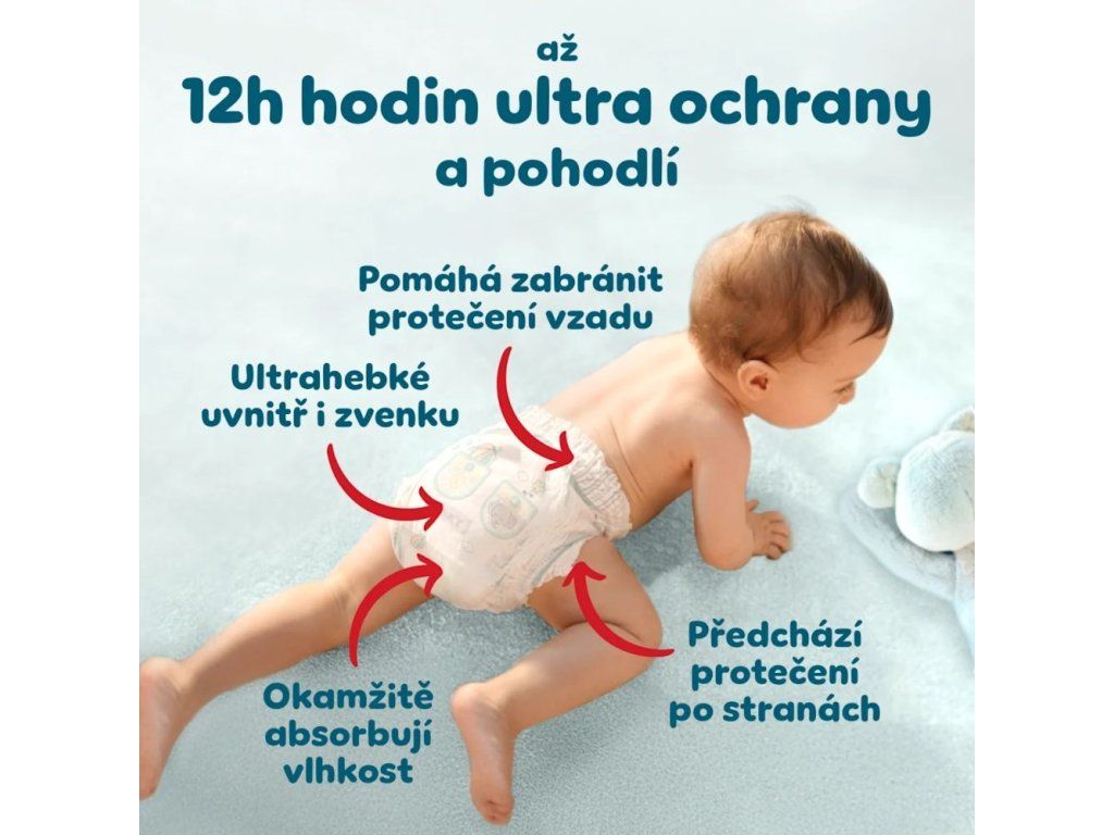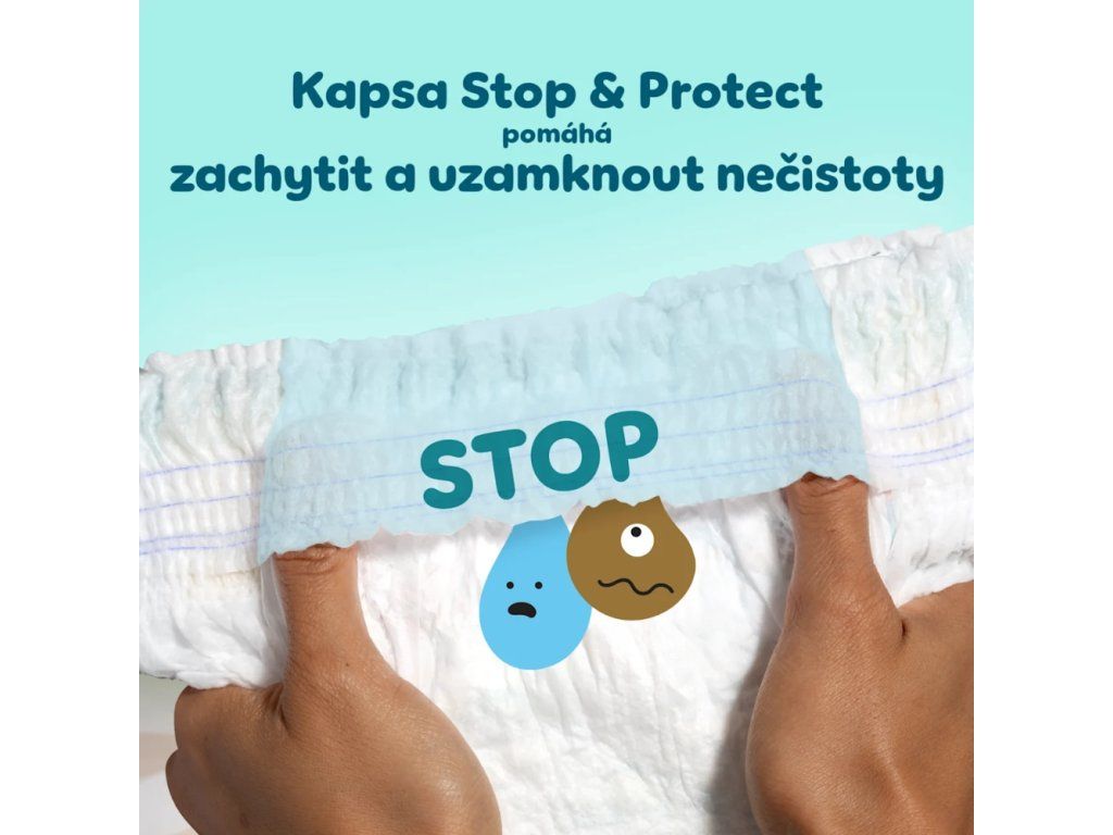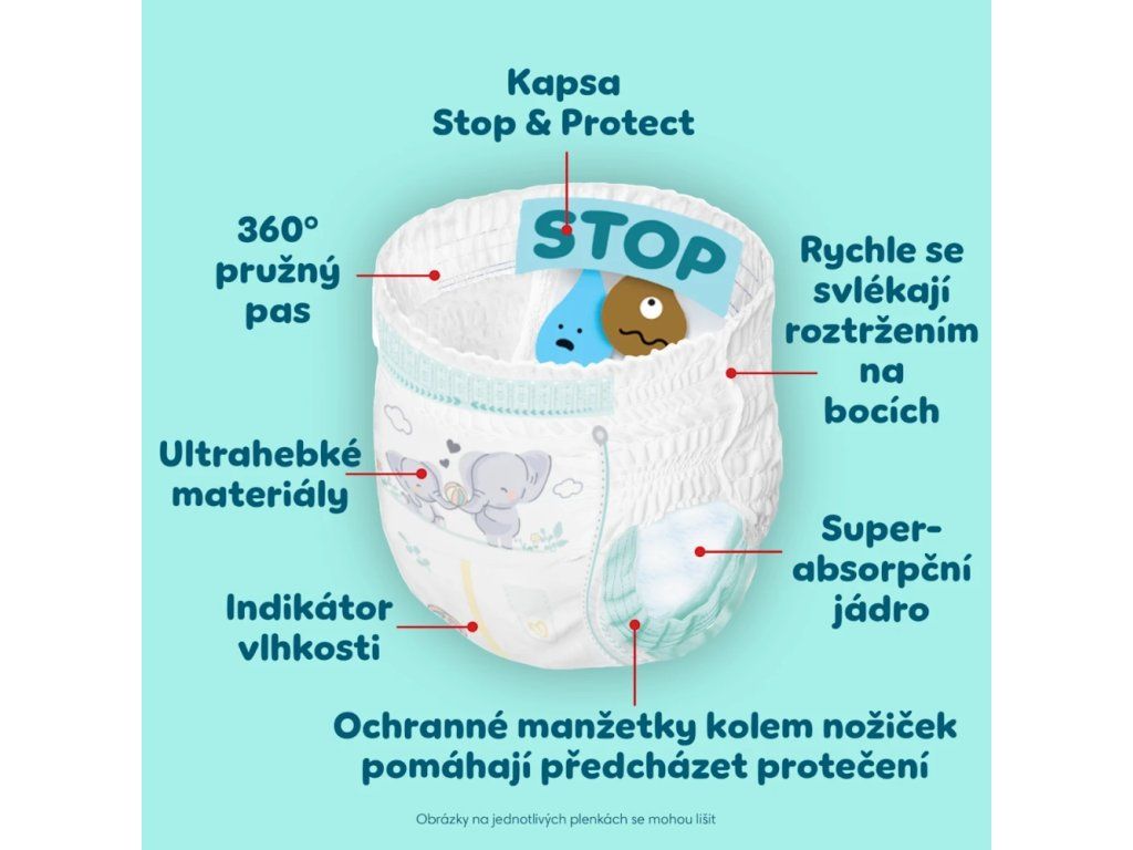 Díky ultra hebkému pružnému pasu 360° FIT se plenkové kalhotky dokonale přizpůsobují tělu vašeho děťátka a umožňují mu pohyb bez omezení. Navíc ochranné hebké manžetky jemně obepnou nožičky, aby zabránily nepříjemnému úniku tekutin. Unikátní kapsa Stop & Protect pomáhá zadržet vlhkost uvnitř plenky, a díky tomu můžete mít jistotu, že i během nočních dobrodružství zůstane vaše děťátko v suchu a pohodlí.