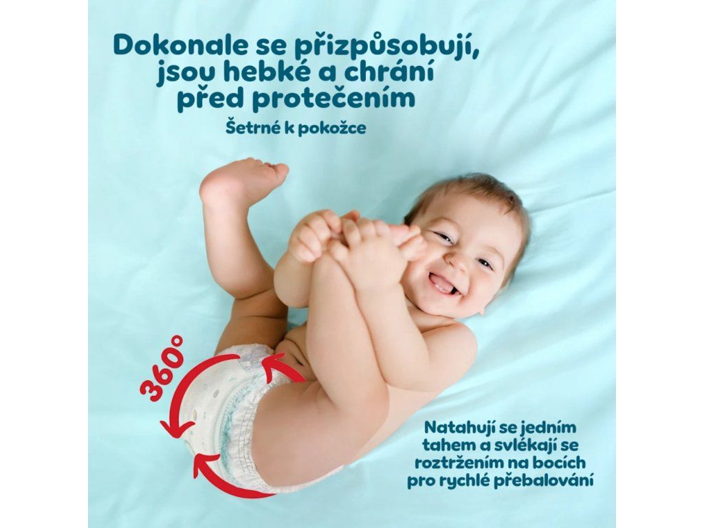 Díky ultra hebkému pružnému pasu 360° FIT se plenkové kalhotky dokonale přizpůsobují tělu vašeho děťátka a umožňují mu pohyb bez omezení. Navíc ochranné hebké manžetky jemně obepnou nožičky, aby zabránily nepříjemnému úniku tekutin. Unikátní kapsa Stop & Protect pomáhá zadržet vlhkost uvnitř plenky, a díky tomu můžete mít jistotu, že i během nočních dobrodružství zůstane vaše děťátko v suchu a pohodlí.