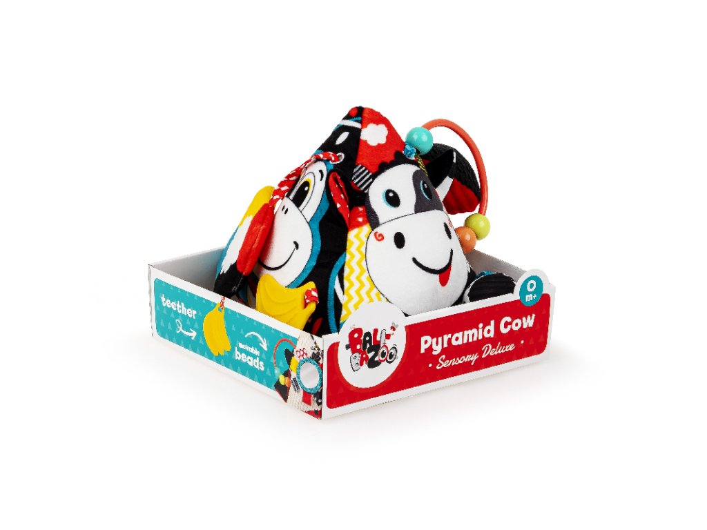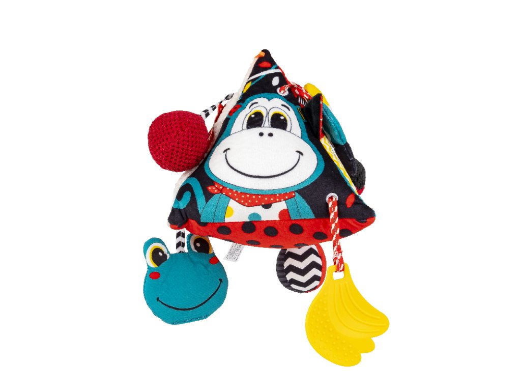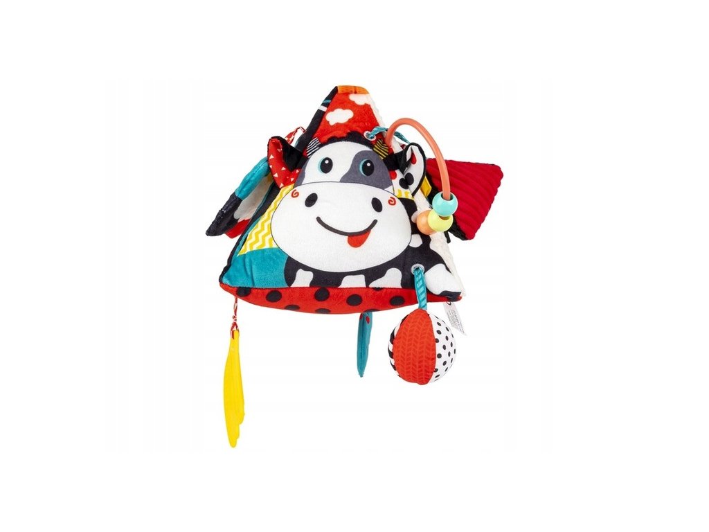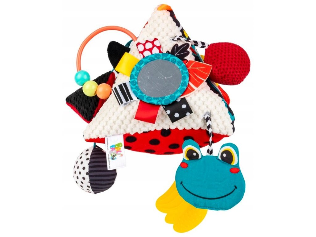 Tato multifunkční hračka plná zvířátek a smyslových překvapení poskytne vašemu dítěti skvělou zábavu! Každá z měkkých stran pyramidy ukrývá poklady, včetně pískačky, bezpečného zrcátka pro sebepoznávání dítěte, obklopeného látkovými visačkami, a dokonce i stužky na tahání, zdobené menšími hračkami, včetně včelky, kterou lze zastrčit do speciální kapsičky. K dispozici je také kousátko s výstupky, ideální pro prořezávání zoubků, které přináší úlevu bolavým dásním vašeho dítěte. Praktická rukojeť v podobě mašle s korálky, kterou lze posouvat prstem, usnadňuje zvedání hračky. Různorodé materiály, ze kterých je pyramida vyrobena, stimulují smysly vašeho dítěte a inspirují ho k objevování světa prostřednictvím svých smyslů.