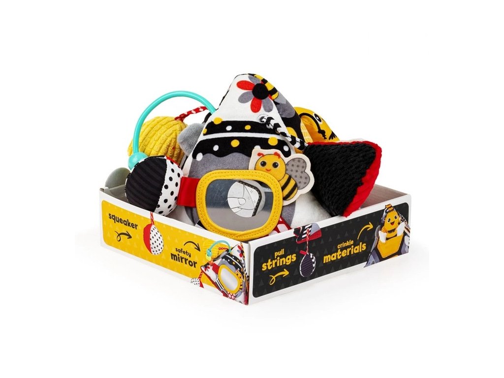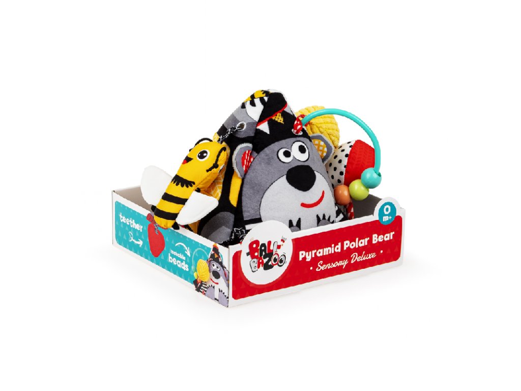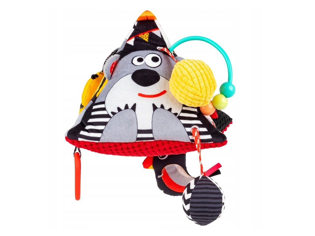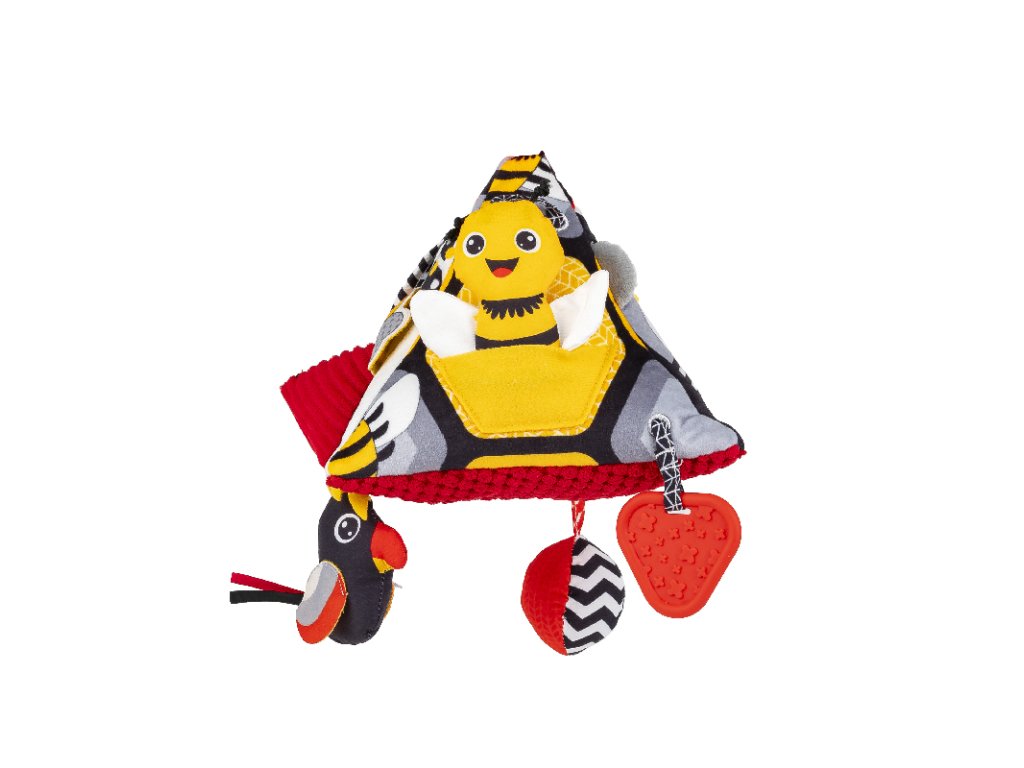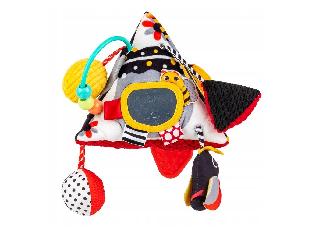 Tato multifunkční hračka plná zvířátek a smyslových překvapení poskytne vašemu dítěti skvělou zábavu! Každá z měkkých stran pyramidy ukrývá poklady, včetně pískačky, bezpečného zrcátka pro sebepoznávání dítěte, obklopeného látkovými visačkami, a dokonce i stužky na tahání, zdobené menšími hračkami, včetně včelky, kterou lze zastrčit do speciální kapsičky. K dispozici je také kousátko s výstupky, ideální pro prořezávání zoubků, které přináší úlevu bolavým dásním vašeho dítěte. Praktická rukojeť v podobě mašle s korálky, kterou lze posouvat prstem, usnadňuje zvedání hračky. Různorodé materiály, ze kterých je pyramida vyrobena, stimulují smysly vašeho dítěte a inspirují ho k objevování světa prostřednictvím svých smyslů.