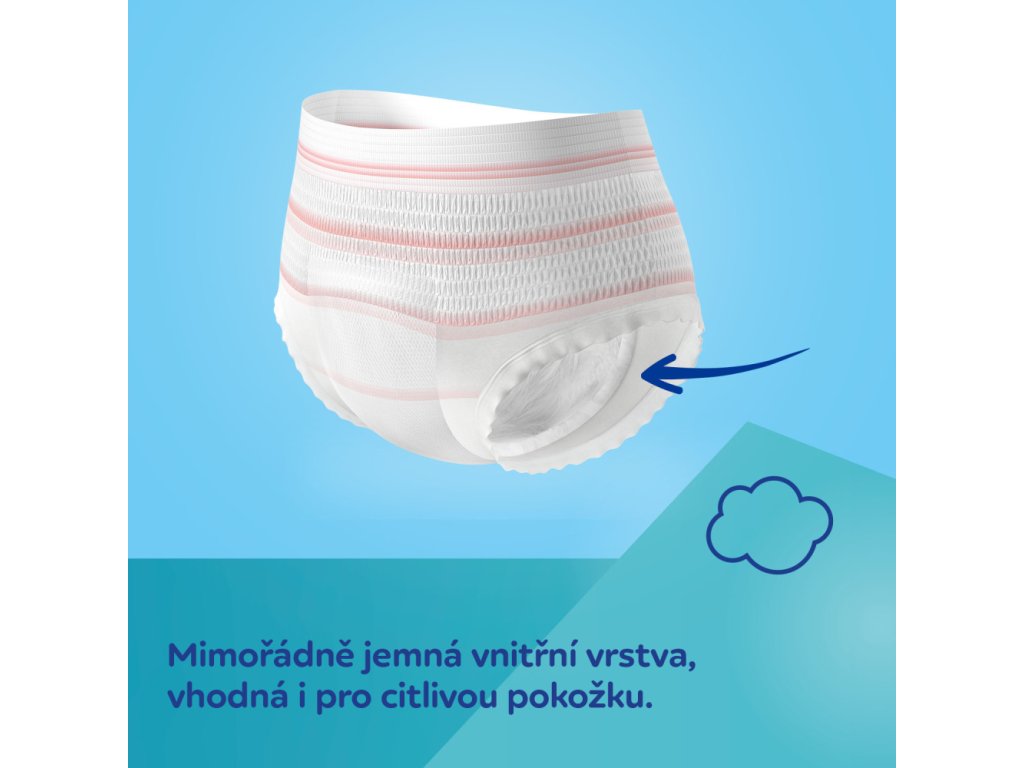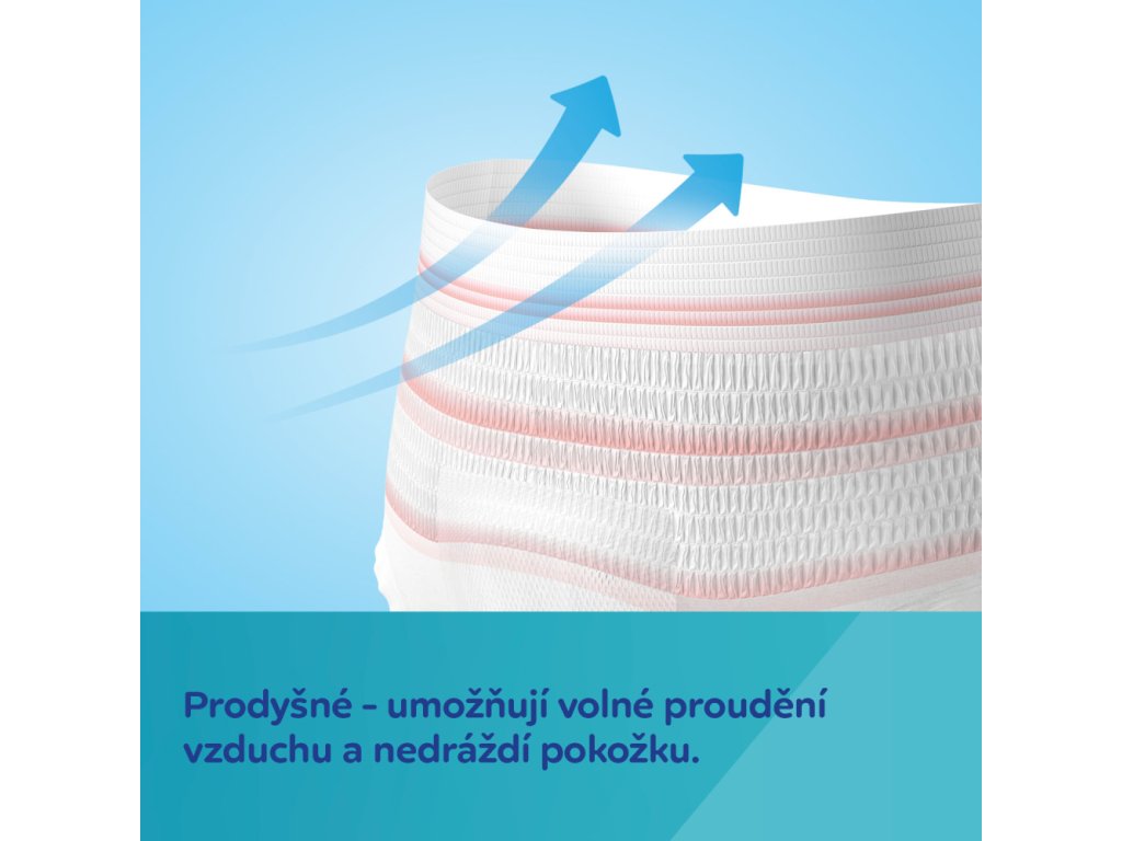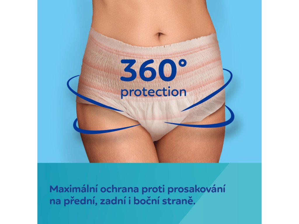Kalhotky absorbují až 400 ml tekutiny a poskytují tak žádoucí pocit sucha. Pokročilá 360° ochrana proti úniku zajišťuje plnou ochranu ze všech stran, a to i vleže. Prodyšný design umožňuje pokožce volně dýchat, čímž se minimalizuje riziko podráždění, zatímco výjimečně měkká vnitřní vrstva je bezpečná i pro tu nejcitlivější pokožku.