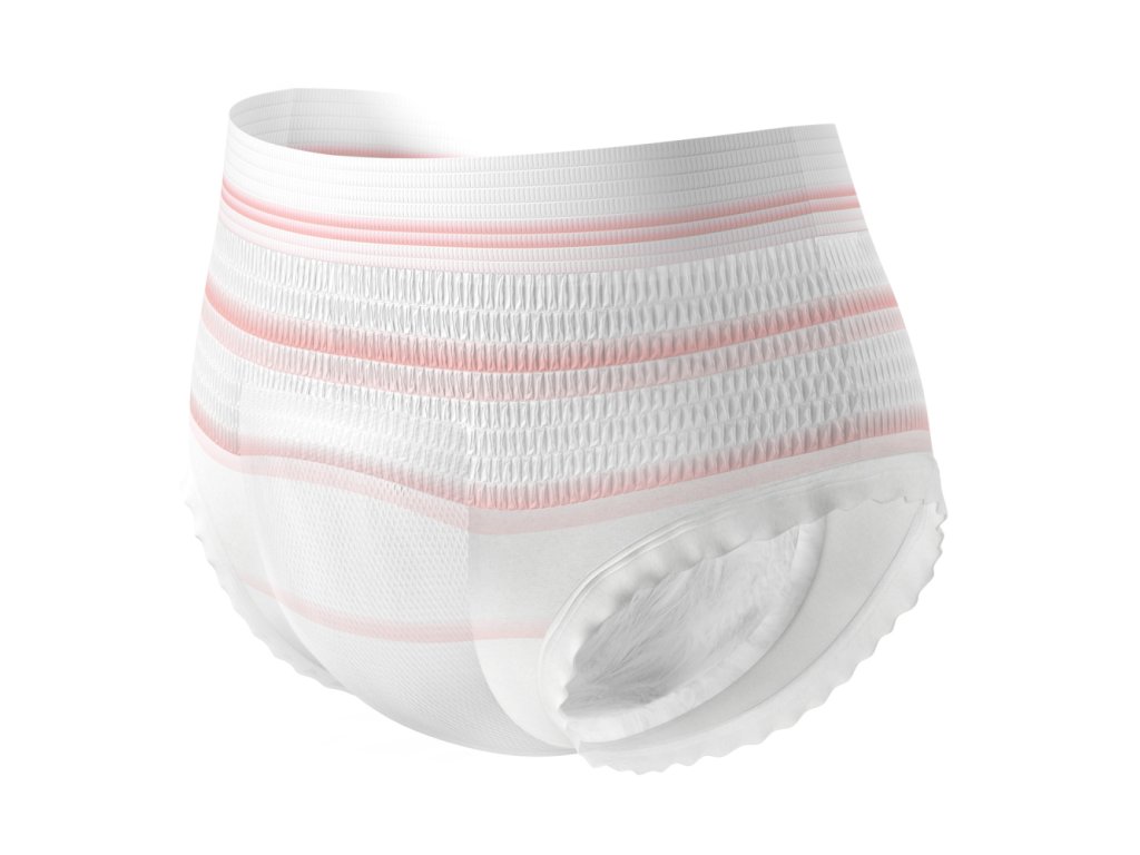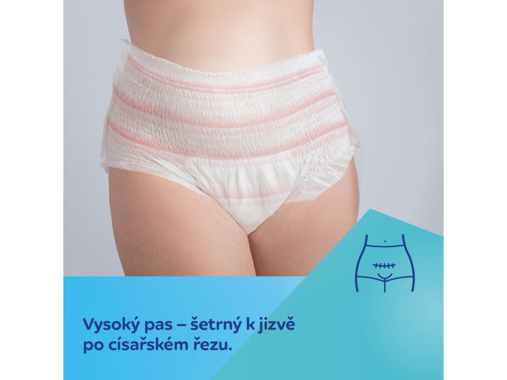 Vysoký elastický pas kalhotek dokonale padne různým typům postav a zároveň je šetrný k jizvě po C-sekci. Boční švy kalhotek je možné pohodlně a jednoduše roztrhnout, což usnadňuje sundání. Kalhotky nejsou bělené chlórem a mají hygienické balení po 1 ks.