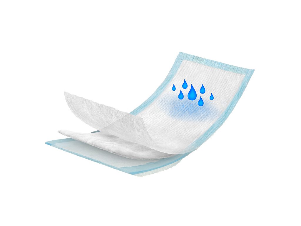 - Vrchní vrstva umožňuje cirkulaci vzduchu a poskytuje pocit svěžesti a superabsorbent uvnitř podložky rychle váže vlhkost a neutralizuje nepříjemné pachy.