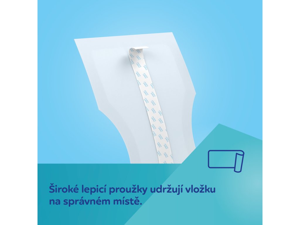 - Fixované - Široký samolepící pásek umístěný po celé délce udržuje vložku na správném místě.