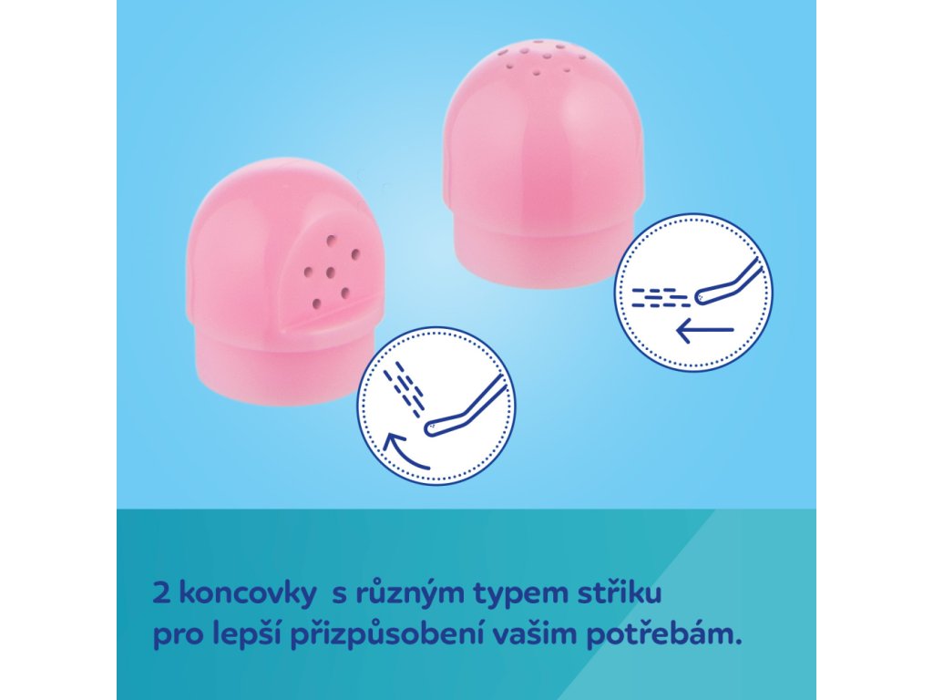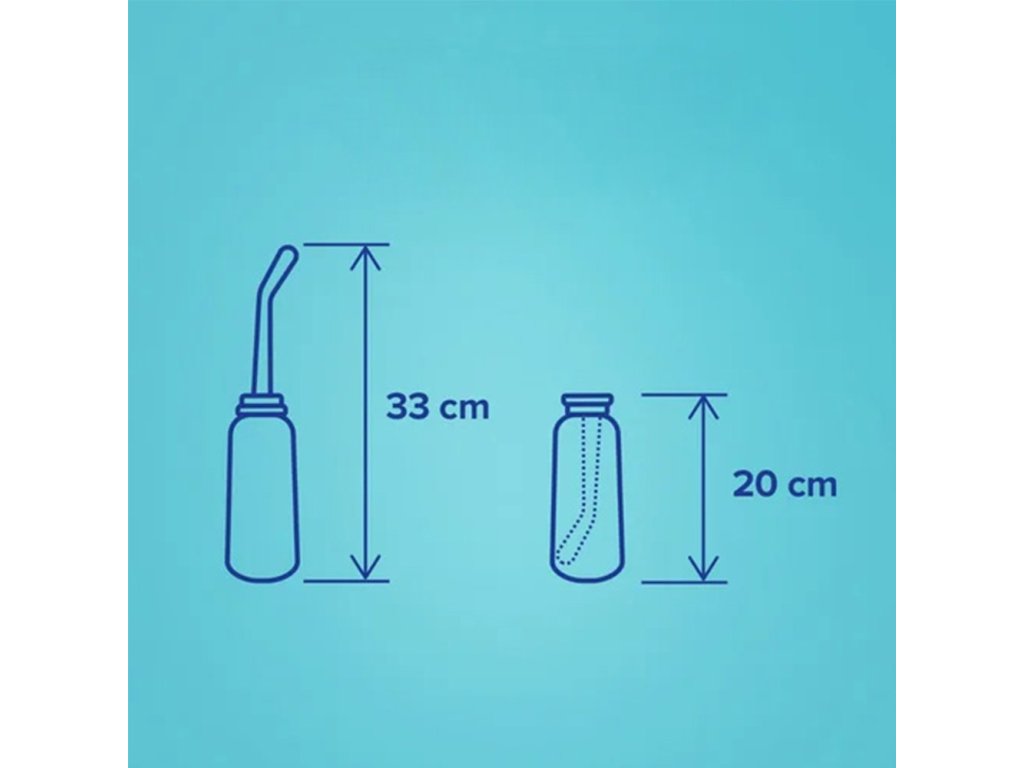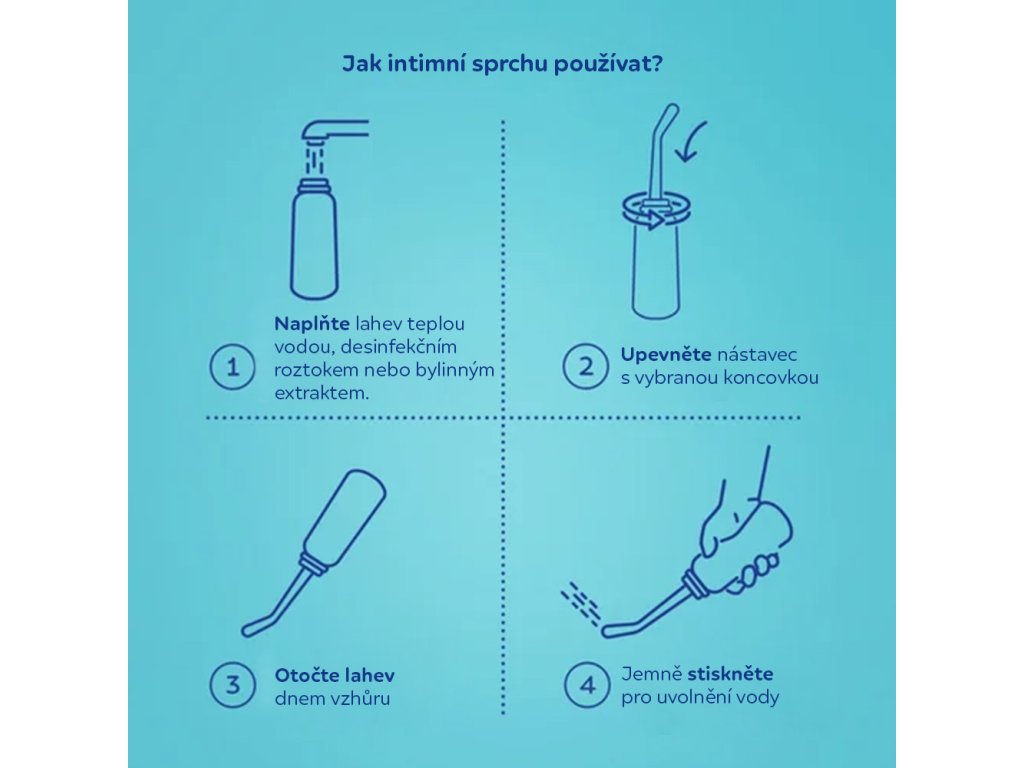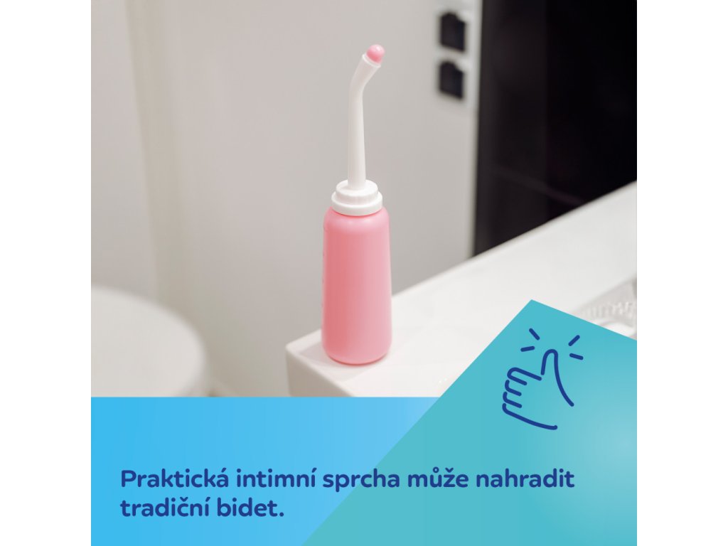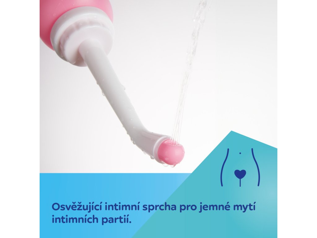 Intimní sprcha s jemným osvěžujícím a revitalizujícím proudem vody usnadňuje péči o hráz a snižuje tak riziko možných infekcí nebo dalšího podráždění. Intimní sprcha je skvělým pomocníkem při udržování denní hygieny v těhotenství, po porodu, při menstruaci, na výletech nebo při vzniklých infekcích. Lahev a její části umyjte v teplé mýdlové vodě a pravidelně přelívejte vařící vodou.